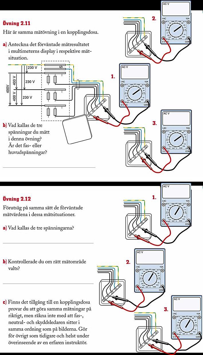 f) Finns det tillgång till en kopplingsdosa provar du att göra samma mätningar på riktigt, men räkna inte med att fas-, neutral- och skyddsledare sitter i samma ordning som på bilderna.