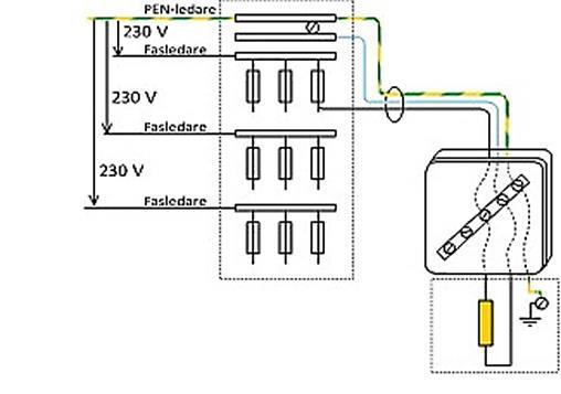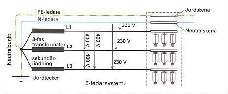 Lägg märke till att huvudspänningarna finns mellan de tre fasledarna och att de är kopplade till var sin fasskena. Till fasskenorna är ena sidan av alla säkringarna (propparna) är anslutna. Andra sidan hos säkringarna kopplas till belastningarna via, t ex enfas vägguttag. Fasspänningarna återfinns mellan PEN-ledaren och respektive fasledare.