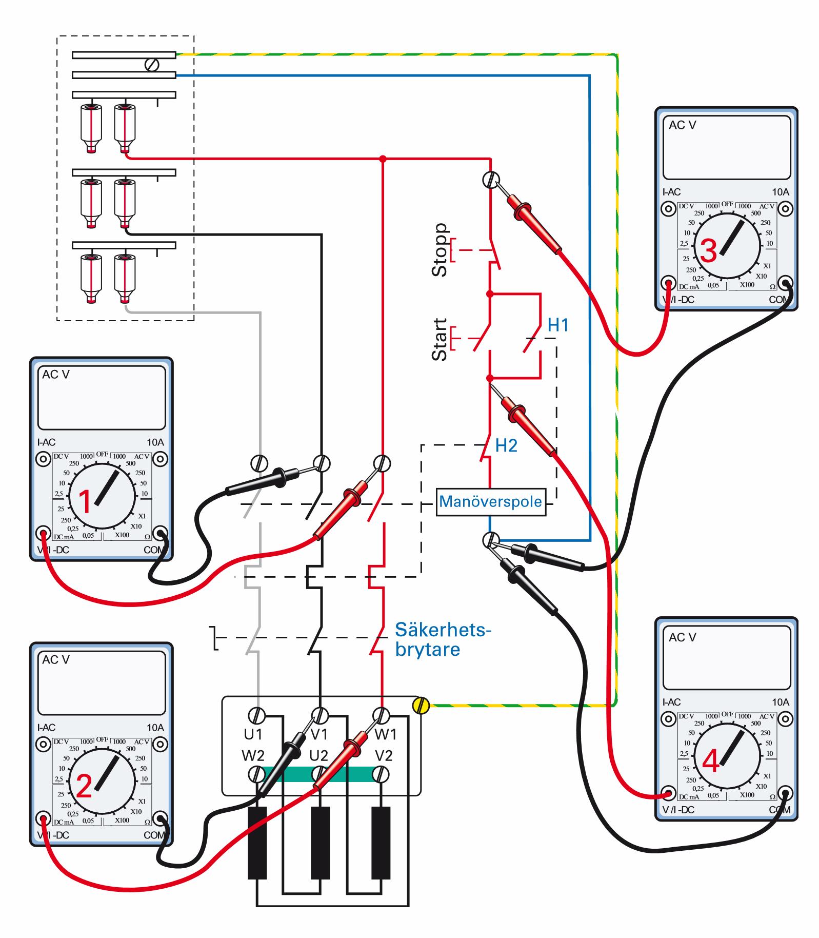 Vad visar multimetrarna om kopplingen är felfri och du tryckt in startknappen strax innan du gör de fyra mätningarna? Skriv svaren i instrumentens displayer.