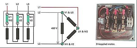 D-kopplad motor. Över varje lindning finns huvudspänningen på 400V. Här går det inte, ock ska inte anslutas någon N-ledare. Observera att motorlindningarna alltid måste vara avsedda för den spänning som läggs över dem. Här är det 400V.