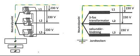 Tvåfasbelastningar ansluts också med tre ledare, två fasledare via två säkringar, ingen neutralledare, men den gulgröna skyddsledaren ska vara med.