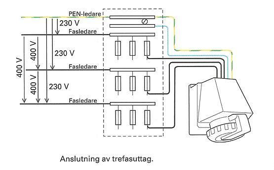 Till trefasuttag kopplas, förutom N- och PE-ledarna alla tre fasspänningarna via varsin säkring. I trefasuttag får elkonsumenten därför tillgång till både fasspänningarna på 230V och huvudspänningarna på 400V mellan L1, L2 och L3.