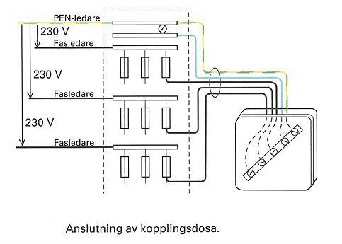 Lägg märke till att det behövs tre ledare. En fasledare via en säkring, en blå neutralledare och den gulgröna skyddsledaren.