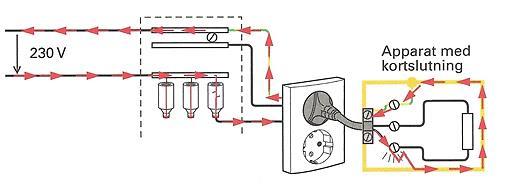 I en apparat med kortslutning till det ledande höljet blir strömmen så stor att säkringen löser ut.