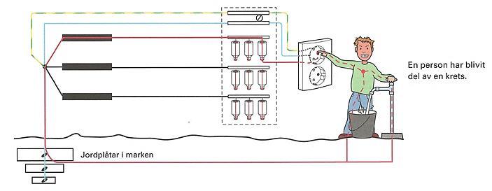 Om en person av någon orsak samtidigt kommer i kontakt med elnätets fasspänning på 230 V och jord, flyter det ström genom personen, precis som genom vilken annan belastning som helst.