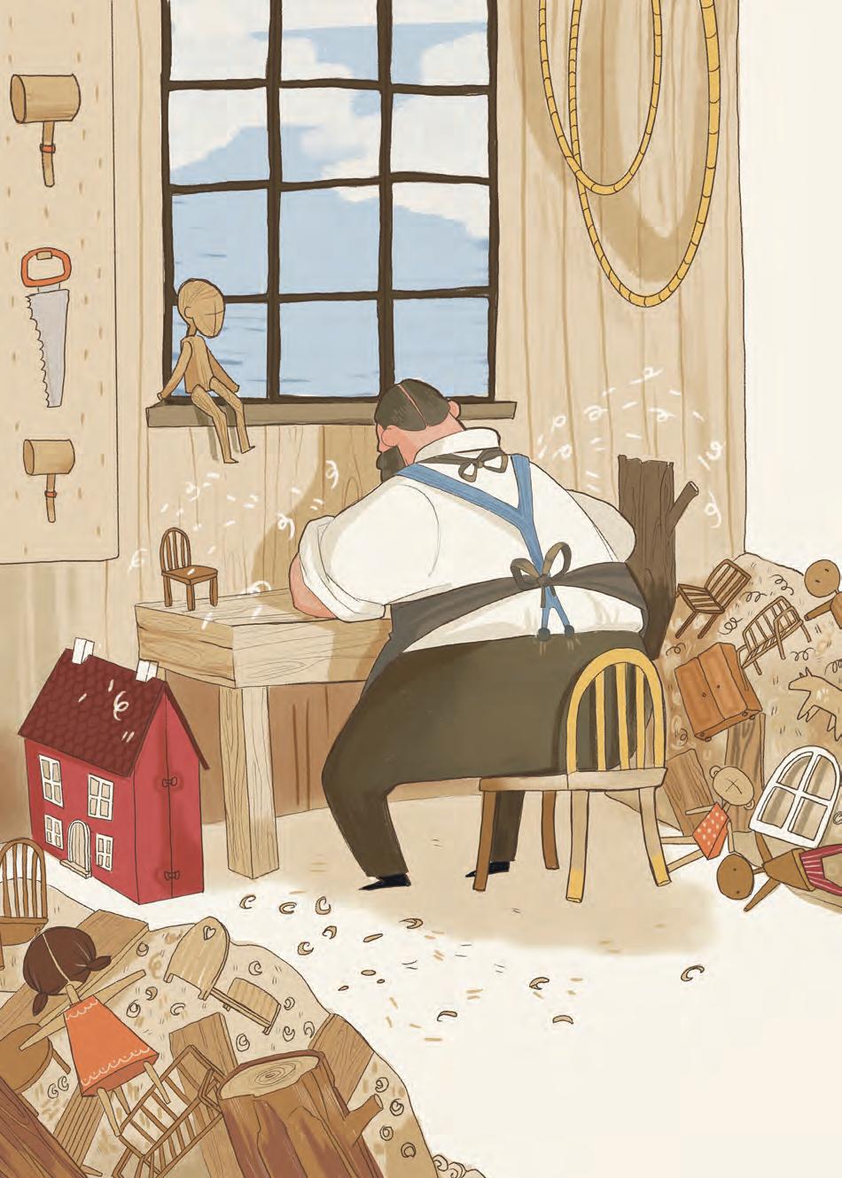 Snickaren tittade på figuren med höjda ögonbryn. Men när hen oförsiktigt kastade över träet så tog han emot det, så varsamt, så varsamt. Som om det faktiskt var ett barn.