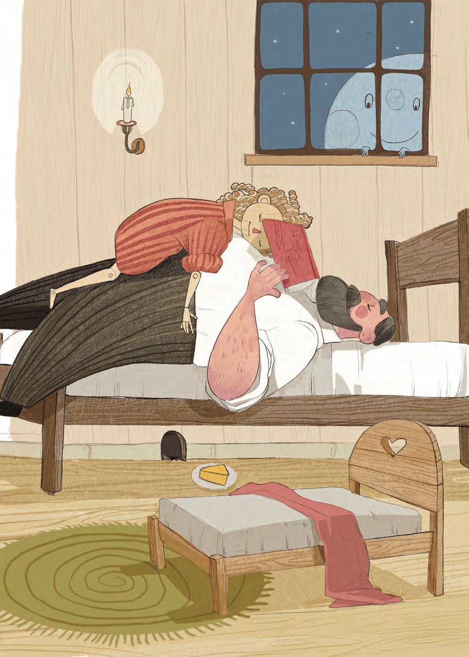 kröp de båda ner i hans säng. Snickaren läste högt ur sin enda bok. Den var full av berättelser om spännande platser långt borta. Han läste tills hans ögonlock blev tunga. Julia somnade vaggad av bröstkorgens rörelser när snickaren snarkade.