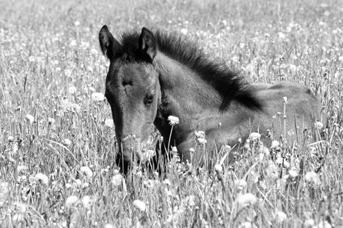 Fölet piper och gör ett hopp upp i luften. På ostadiga ben stannar det till för att nyfiket titta på barnen.