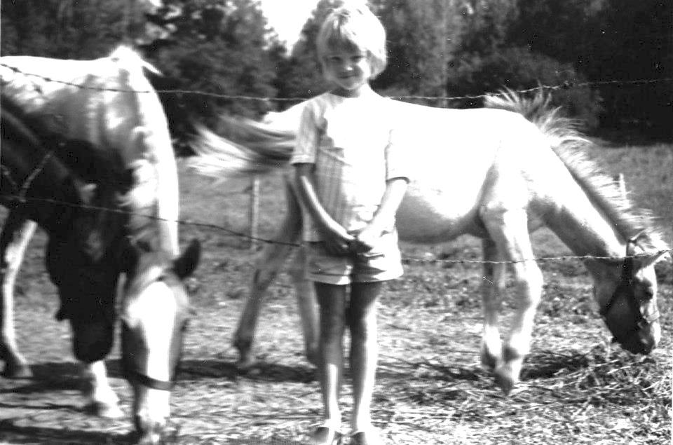 Jag, 6 år, superlycklig, på Stora Berget i Lagga. Hästarna hette Pollux, Inca och Branting,