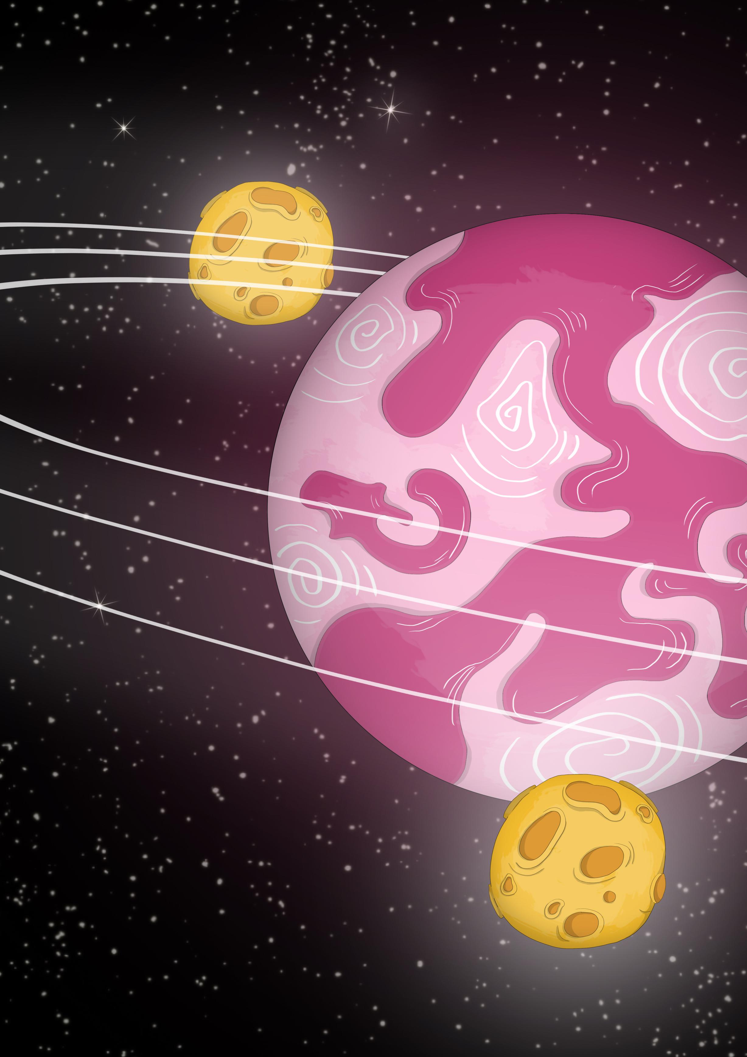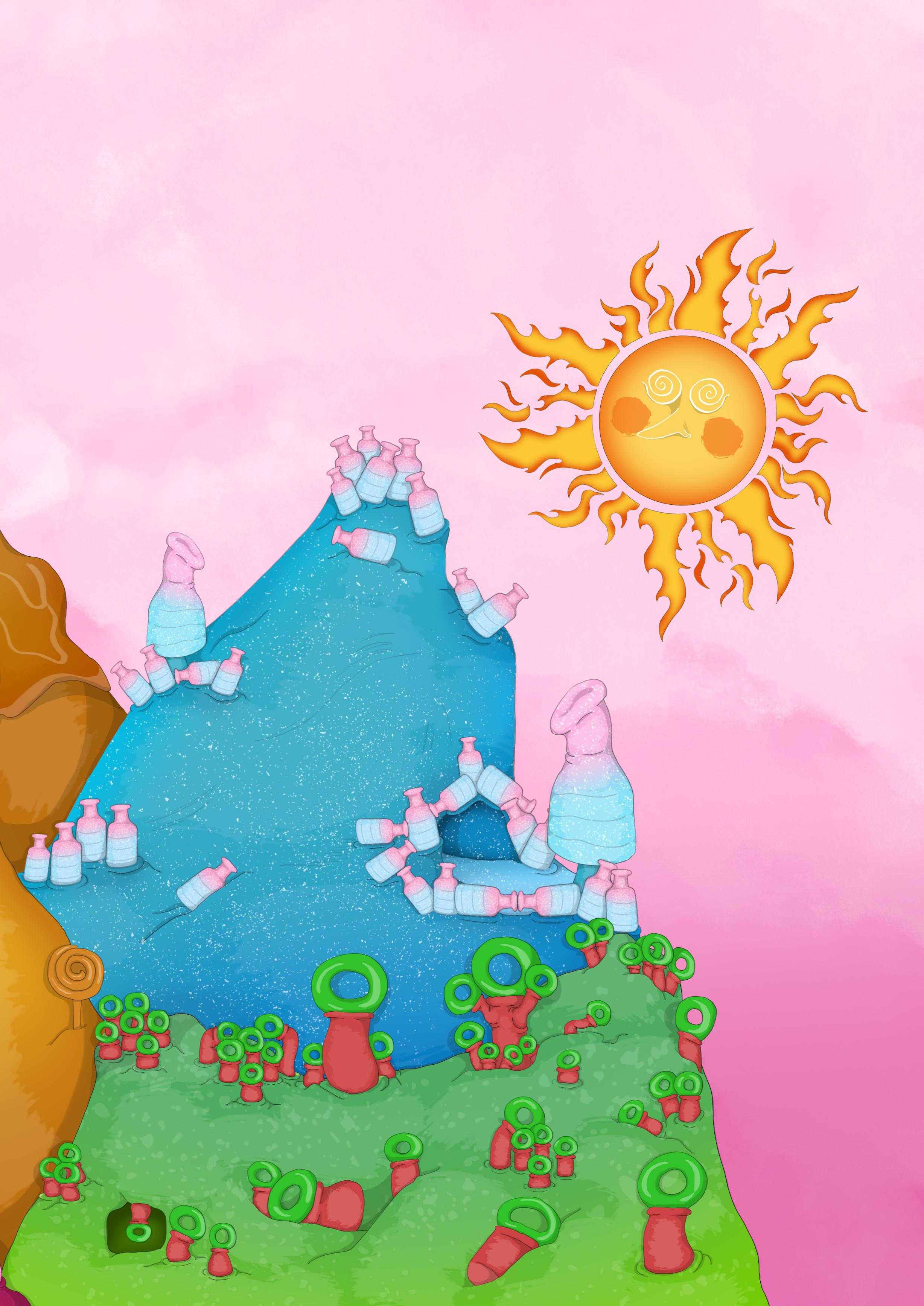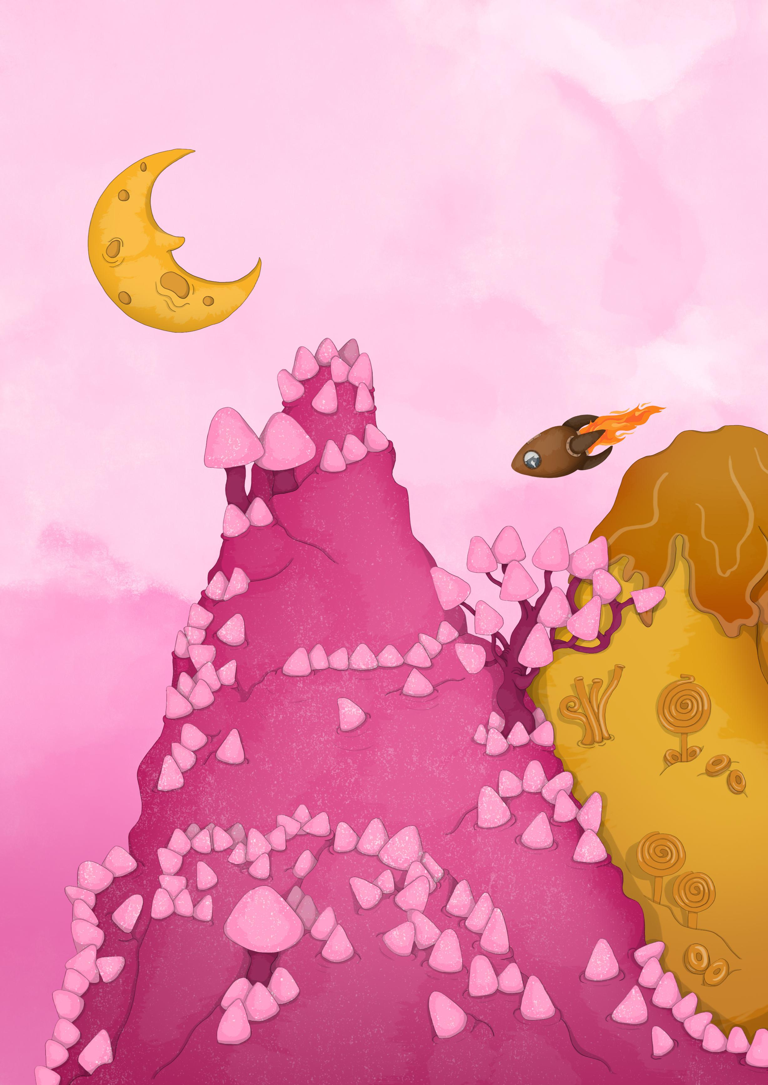 Stjärnorna blev allt färre och snart var raketen omgiven av stora fluffiga moln istället. Den lilla gröna gubben landade raketen på ett högt berg. När barnen tog sig ur och kände marken under sina fötter, möttes de av en doft av hallon. Marken var alldeles mjuk och rosa.