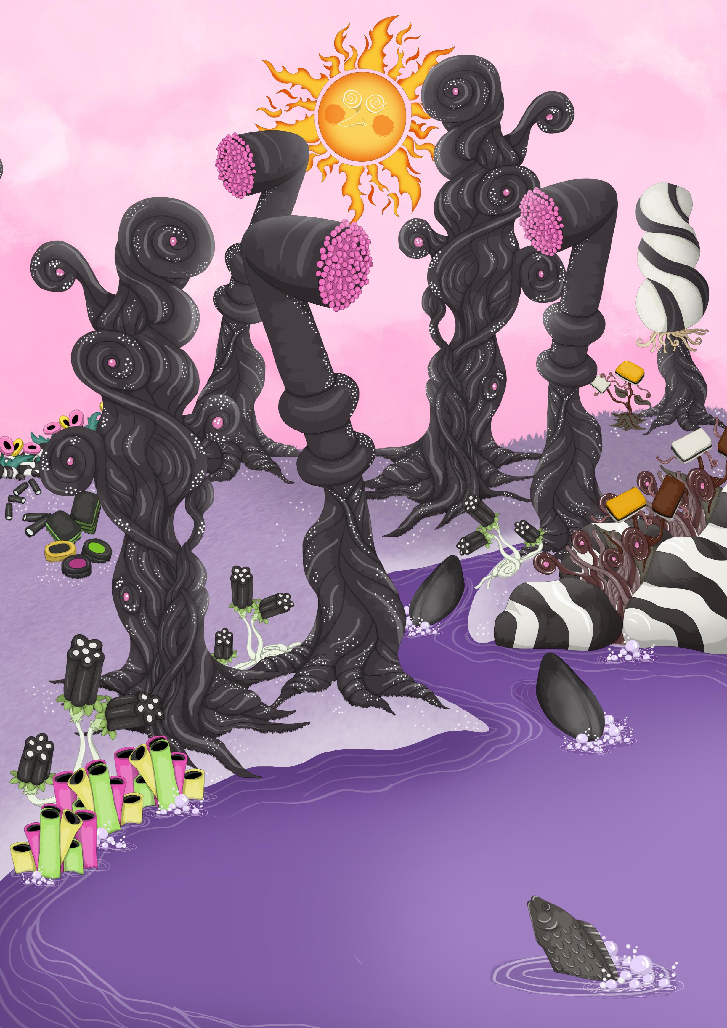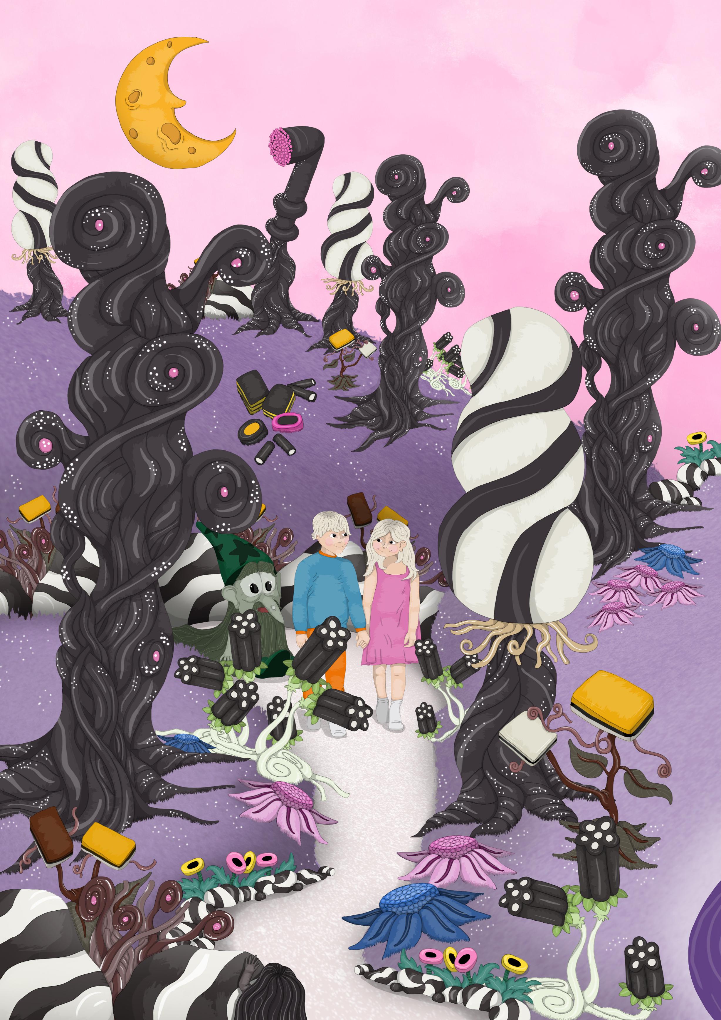 Plötsligt såg de något springa snabbt mellan de svarta träden i Lakritsskogen.