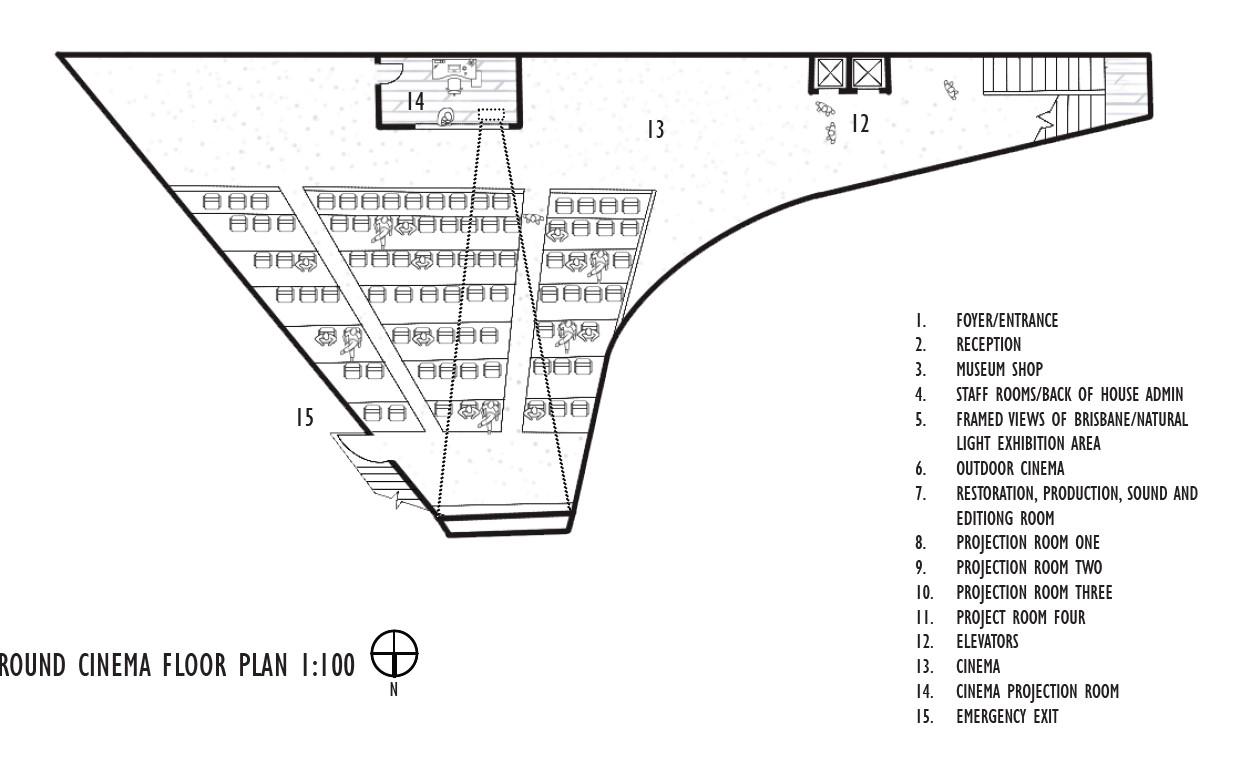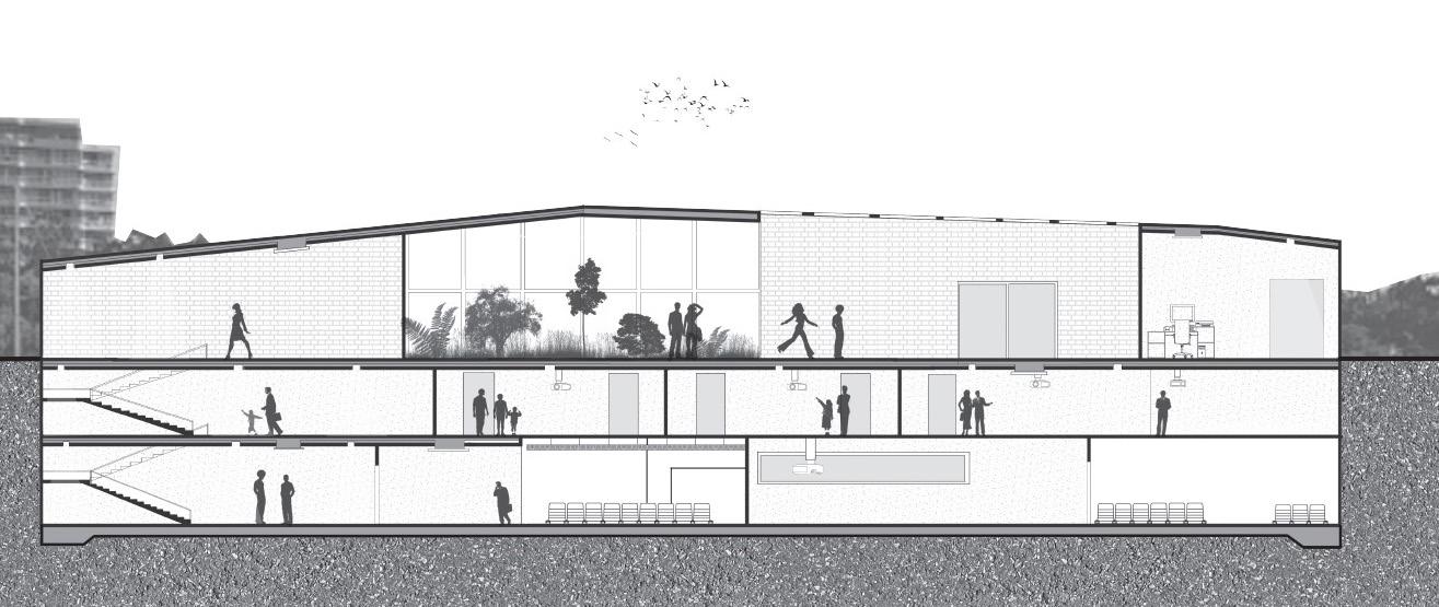 With level one framing views of the story bridge, level two displays local artists work in an exhibition style space, and level three has an underground movie theatre allowing local directors to display there cinematography. All whilst enhancing mowbray park.
