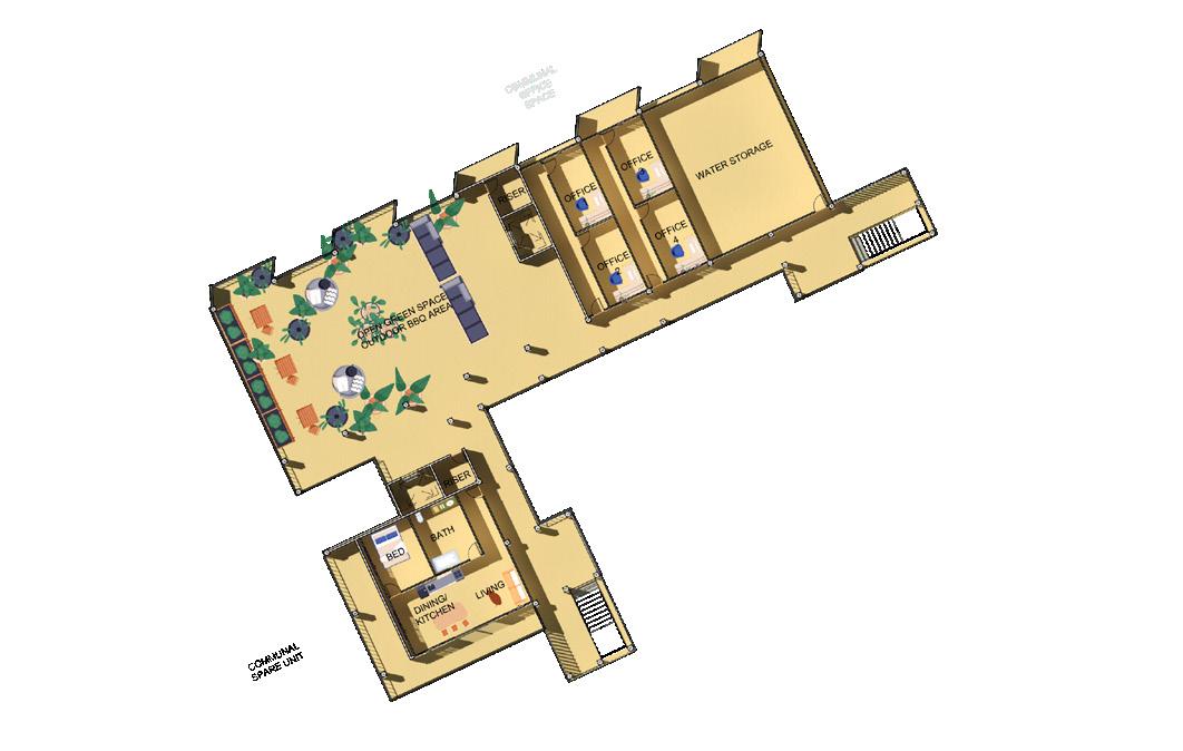 The residential apartments have a communal laundry, storage, bike storage, and a shared car space on the ground floor. The top floor includes shared spaces for outdoor entertainment, home office space and a unit visitors can utilise as a spare room when visiting friends or family from interstate or overseas. Lastly, each apartment is provided with an open space directly next to the dwelling. This space can be retro-fitted by the users at a later date to be adapted according to the users needs.