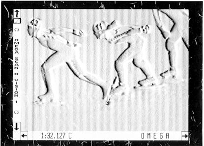 Le Scan’O’Vision d’Omega produisait des images des ondes sinusoïdales du courant alternatif rendues visibles par la caméra électronique de photofinish. Chaque ligne verticale représente une unité de temps. Les variations de puissance de la lumière se reflètent dans l’image. Comme d’autres caméras de photofinish, le Scan’O’Vision aidait à déterminer les arrivées serrées, comme en patinage de vitesse sur piste courte (illustré).