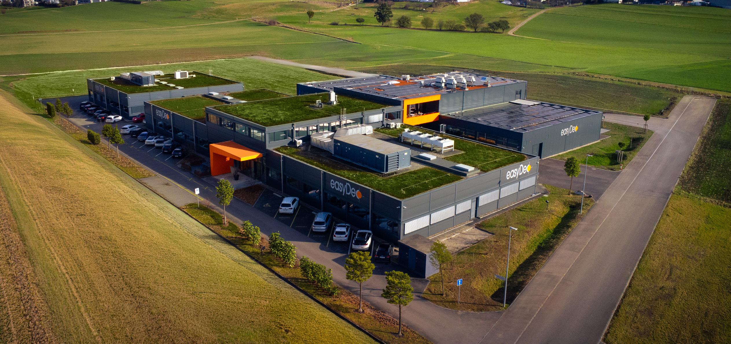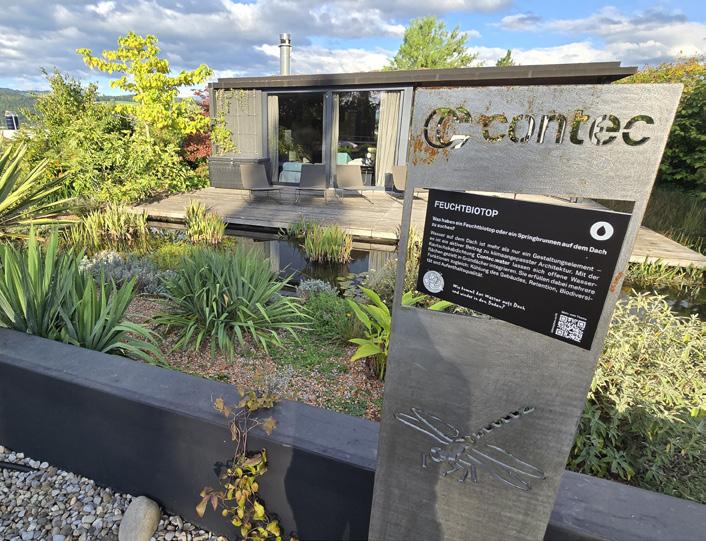 es toits plats peuvent aujourd’hui faire bien plus que protéger un bâtiment. Ils retiennent l’eau de pluie, rafraîchissent leur environnement et créent de nouveaux habitats. Sur le site industriel d’Uetendorf, le toit de Contec s’est transformé en véritable oasis : arbustes, fleurs sauvages, plantes résistantes à la sécheresse, étang avec roseaux et nénuphars, pavillon ombragé et même quatre ruches produisant environ dix kilos de miel par an. Lors des fortes chaleurs, la différence est palpable : tandis que les surfaces au sol peuvent atteindre 40 °C, le jardin sur le toit reste agréablement tempéré.