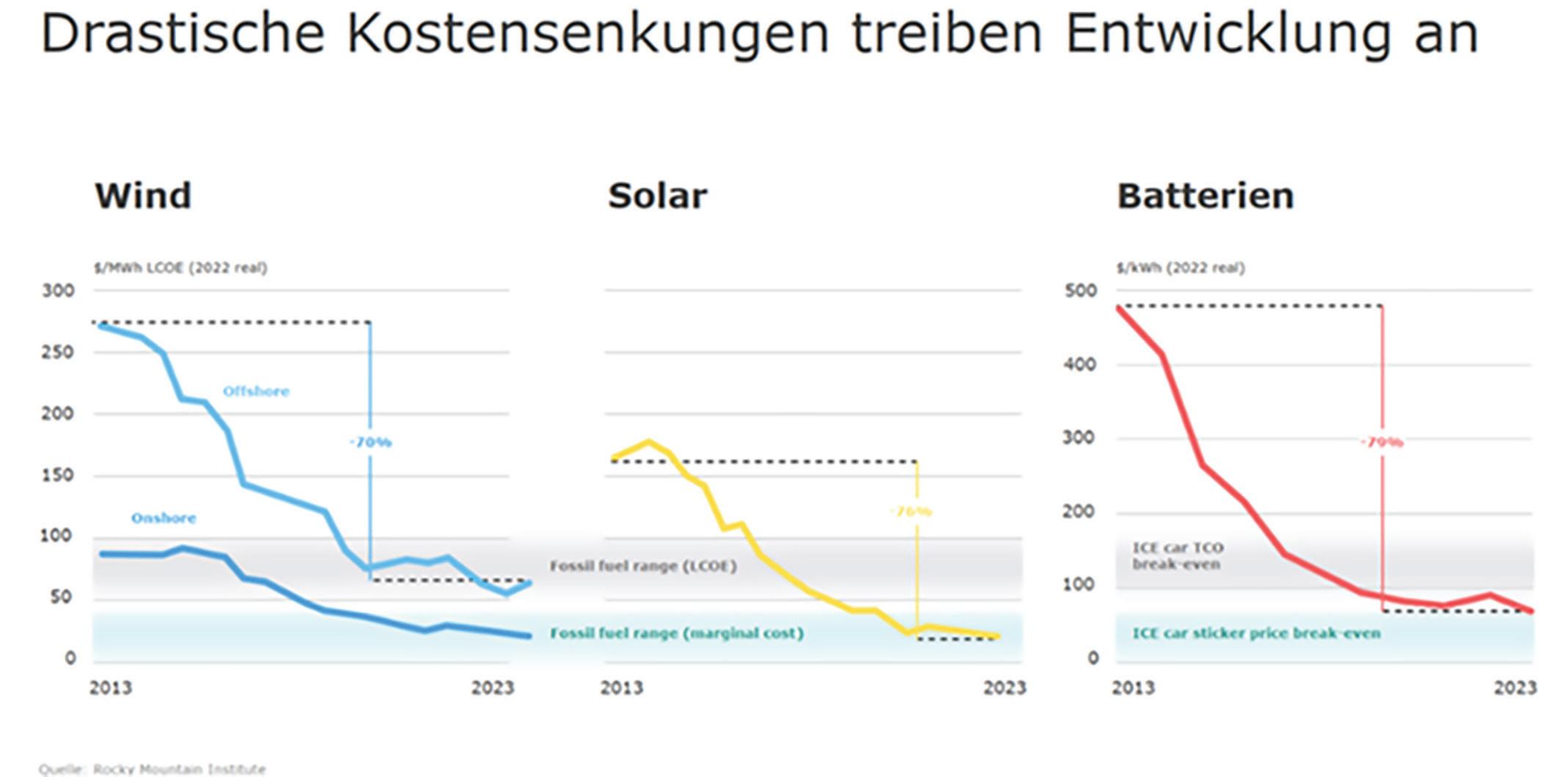 Eine ähnliche Entwicklung ist bei der Elektromobilität zu beobachten. Vor einigen Jahren waren Elektroautos teuer und unpraktisch, da ihre Reichweite begrenzt war und nur wenige Ladestationen zur Verfügung standen. Auch hier hat sich die Situation aufgrund technologischer Entwicklungen grundlegend verändert und heute sind weltweit mehr als 20 Prozent aller verkauften Autos elektrisch. In Ländern mit tiefen Strompreisen wie in Skandinavien ist der Anteil viel höher. Der Verbrennungsmotor verschwindet nicht wegen «grüner Politik», sondern weil es sich um eine veraltete Technologie handelt.