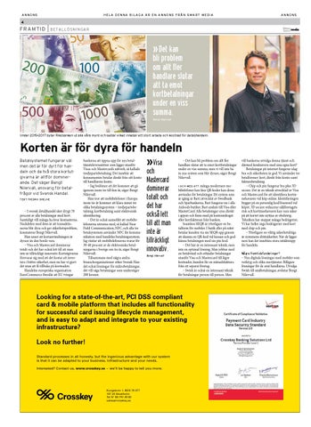 vill bankerna utvidga denna tjänst och därmed konkurrera med sina egna kort? Betalningar på internet fungerar idag bra och säkerheten är god. Vi använder tre betalformer: kort, direkt från konto samt fakturabetalning. – Chip och pin fungerar bra plus 3D secure. Det är en teknik utvecklad av Visa och Mastercard för att identifiera kortinnehavaren vid köp online. Identifieringen bygger på en personlig kod/lösenord vid köpet. 3D secure reducerar säljföretagets risk och kortinnehavaren kan vara säker på att kortet inte nyttjas av obehörig. Tekniken har stoppat många bedrägerier. Vi har heller inga bedrägerier med kort med chip och pin. – Ytterligare en viktig säkerhetsfråga är systemens driftsäkerhet. När de ligger nere kan det innebära stora intäktstapp för handeln.