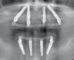Wartezeiten mit herausnehmbaren Provisorien. Bereits fünf Stunden nach dem Eingriff konnte die Patientin mit festsitzenden und belastungsfähi gen, auf den Implantaten verschraub ten provisorischen Brücken nach Hause zurückkehren.