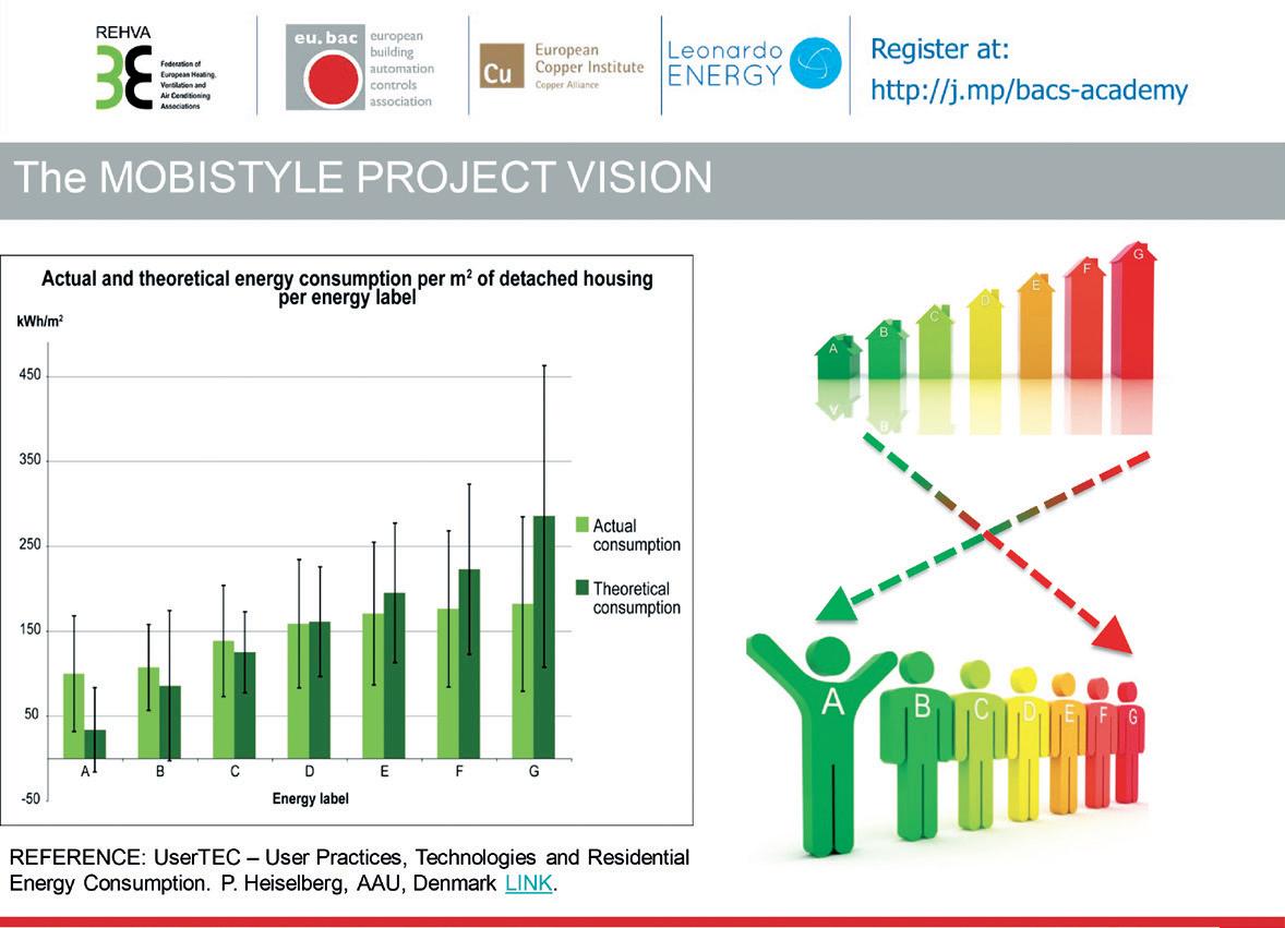 Directive 844/2018 EPBD introduced a new indicator called SRI, Smart Readiness Indicator. This indicator is the real novelty of the energy performance of buildings, born from the principle of the European green deal and the push to digitise objects and services. In fact, it is now a certainty that a building with a good level of automation can obtain important energy performance, reducing its needs by up to 30% (Source: UNI EN 15232-1, BAC factor office heating, from automation class C to class A.) But there is a problem: the design efforts aimed at energy efficiency can be compromised by the behaviour of a user who is not aware of their role: if the user does not collaborate, the results can in fact be very different from those expected. (FIGURA 1) In energy efficiency, the psychological part, and consequently the behavioural part, of the users of the building is fundamental: have you ever noticed how thermostatic valves and temperature controllers are managed, especially in offices? Very often they are set to the maximum possible consumption, and then maybe keep the windows open at the same time (pandemic emergency apart of course.) There is a very insidious effect that leads users to consume more, especially when they are aware of that a certain service is particularly energy efficient. It seems strange, even absurd, and in fact it is a paradox: the famous “Jevons paradox”, also known as the “rebound effect.” In this regard, I would like to mention a European project called Mobistyle which has highlighted this effect also in the field of household appliances with an energy label. In the following figure we can see how the real consumption of an object not particularly performing from an energy point of view (class G) is much lower than the theoretical one. On the other hand, when an object is very efficient (class A), real consumption is much greater than expected. We can therefore conclude that unfortunately, an object in class A does not correspond to a user in class A.(FIGURA 2)