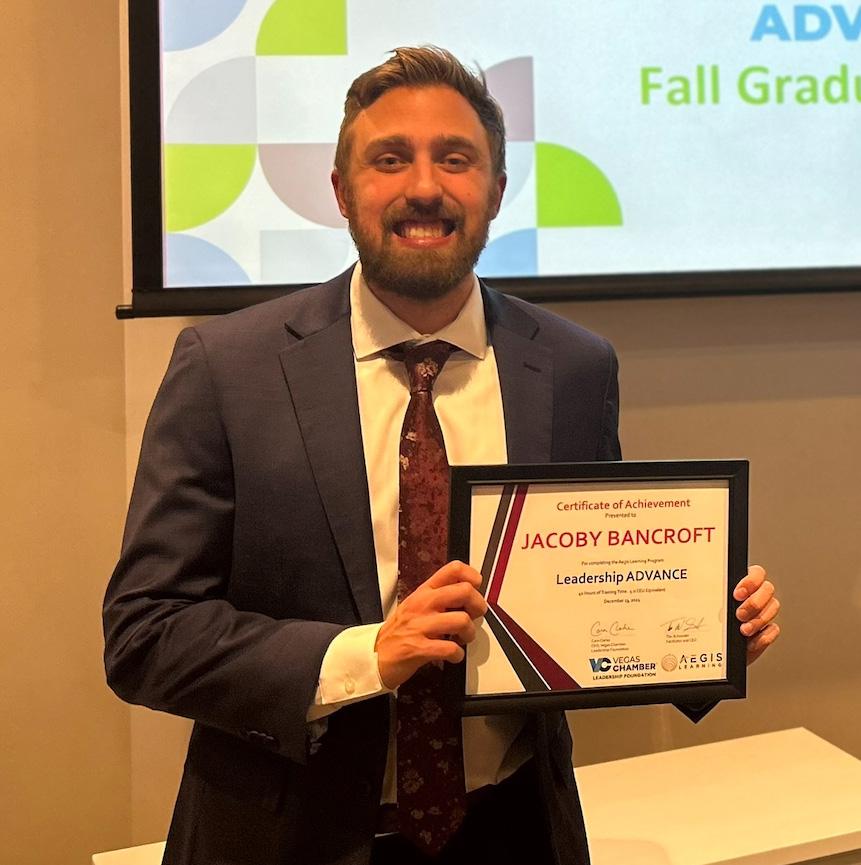 Jacoby Bancroft recently graduated from the Leadership Advance program; an intensive fivemonth leadership development course offered exclusively through the Las Vegas Chamber of Commerce. Through specialized training with Aegis Learning, Jacoby enhanced essential skills such as communication, strategic decision-making, and emotional intelligence. This achievement shows a commitment to growing both personally and professionally, making him an even stronger leader. Well done, Jacoby, and best wishes for success and growth in this next chapter of your career!