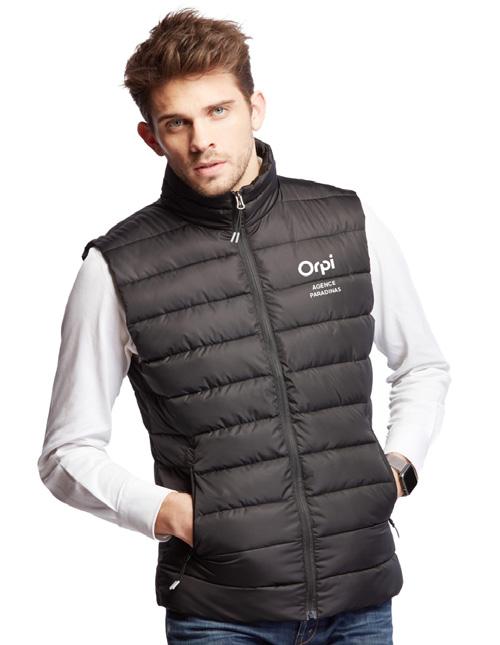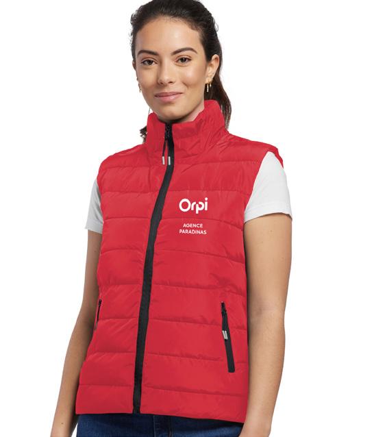 L’alliage imperméable de nylon et d’élasthanne du revêtement extérieur construit une ligne voluptueuse sur le corps. La parka est doublée d’une doudoune. Un patch Velcro sur la manche gauche permet d’apposer un patch rouge imprimé Orpi.