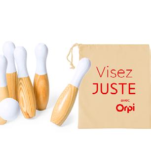 Jeu publicitaire plein air idéal ! Directement issu d’un jeu traditionnel finlandais, ce jeu de quilles scandinaves promet des parties conviviales sur la plage ou dans le jardin. Ce jeu publicitaire en bois de pin robuste s’adresse à tous vos collaborateurs et clients. « Visez juste avec Orpi » est imprimé sur la pochette de rangement en coton.