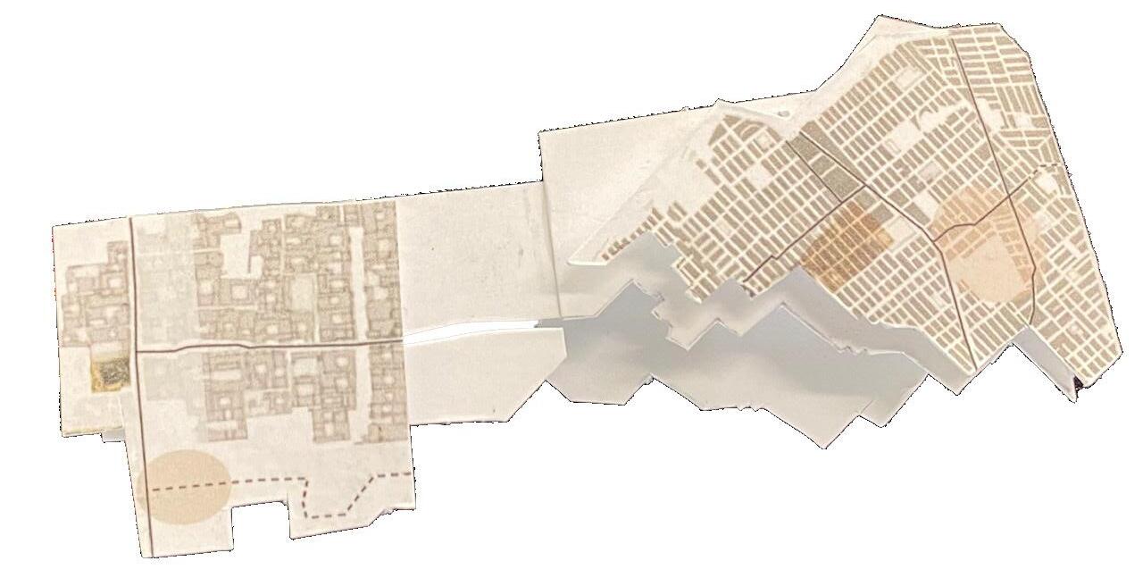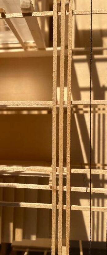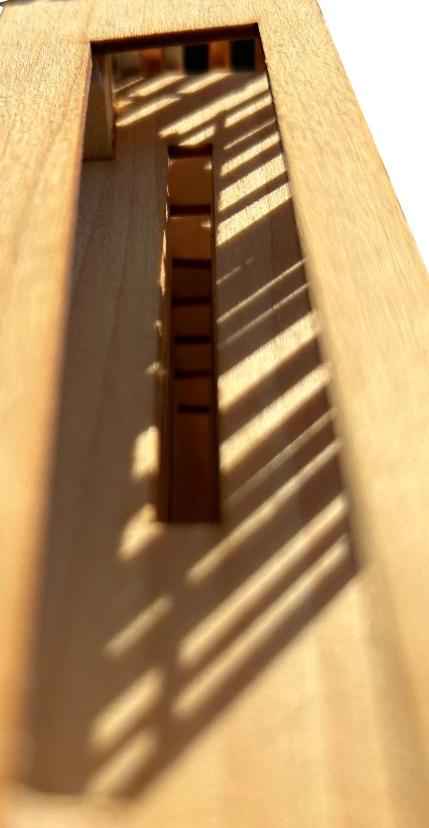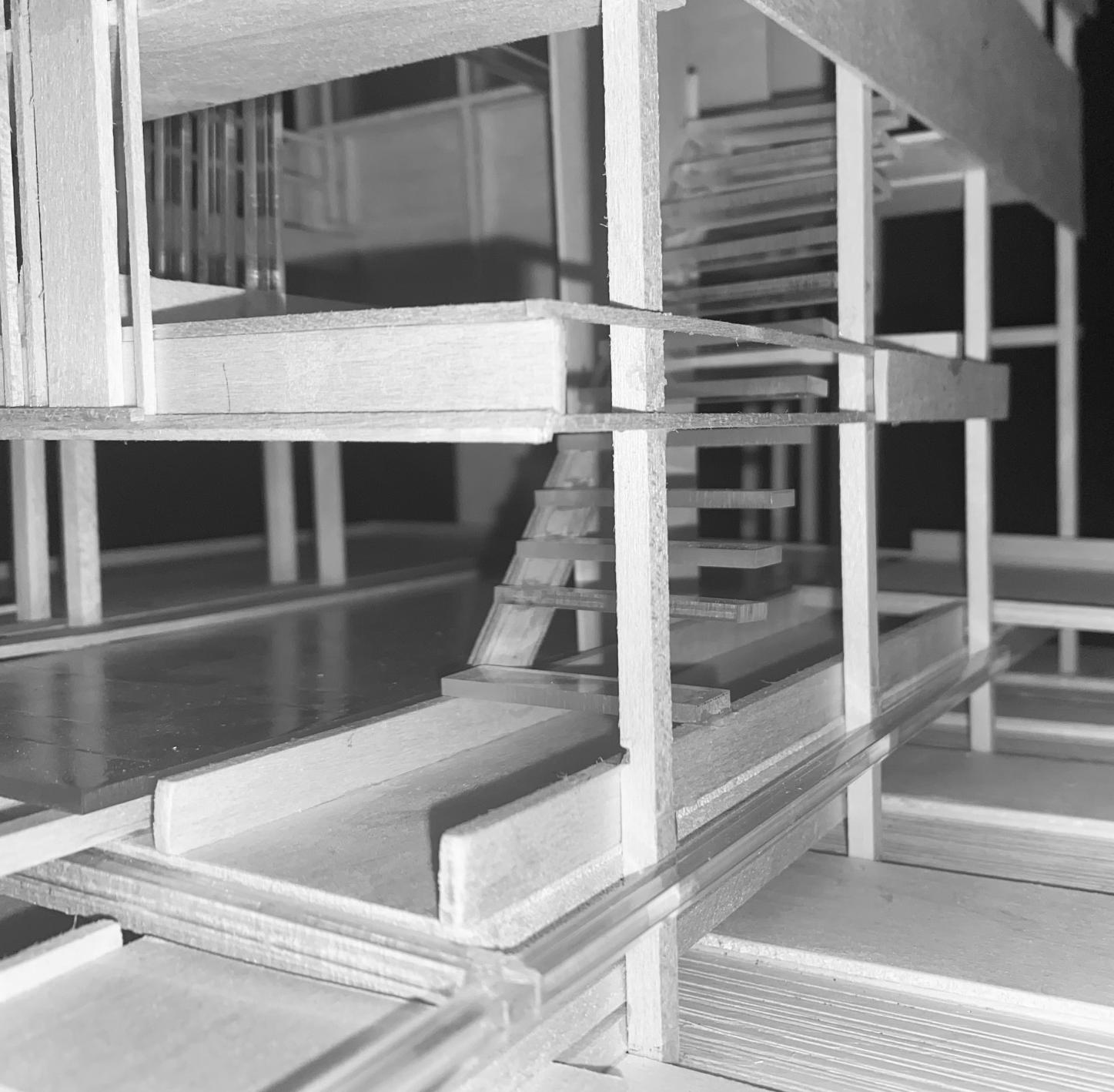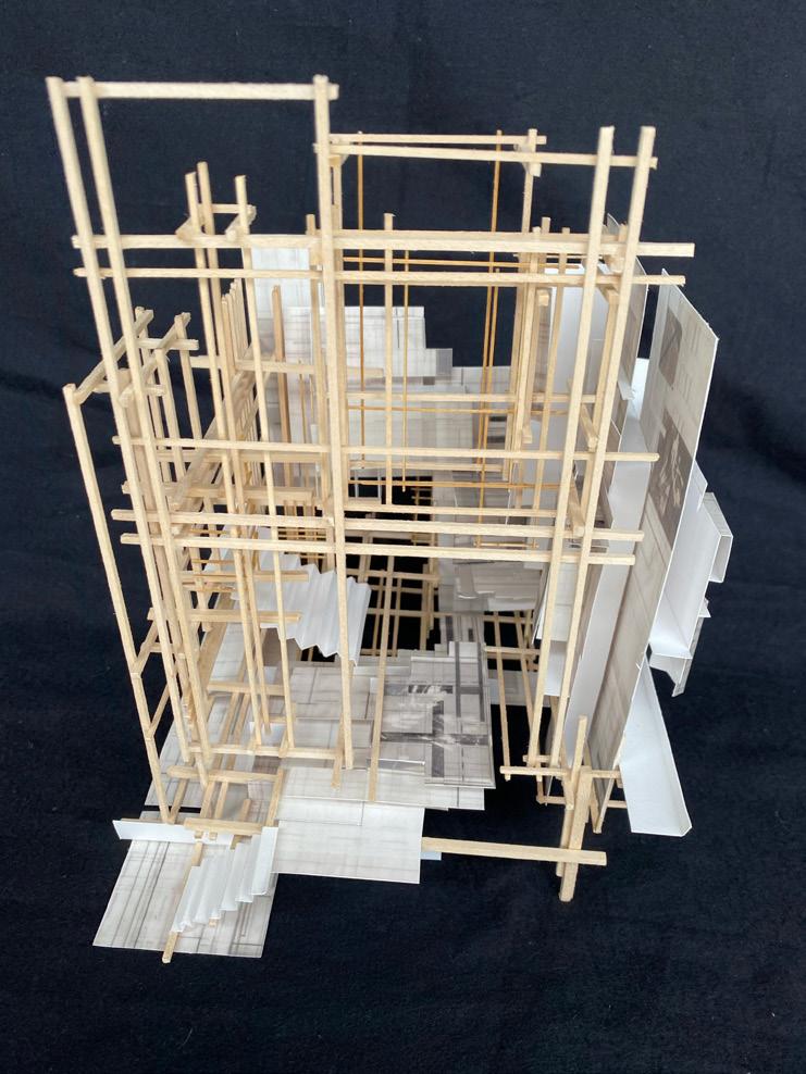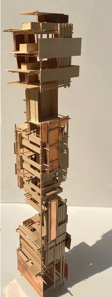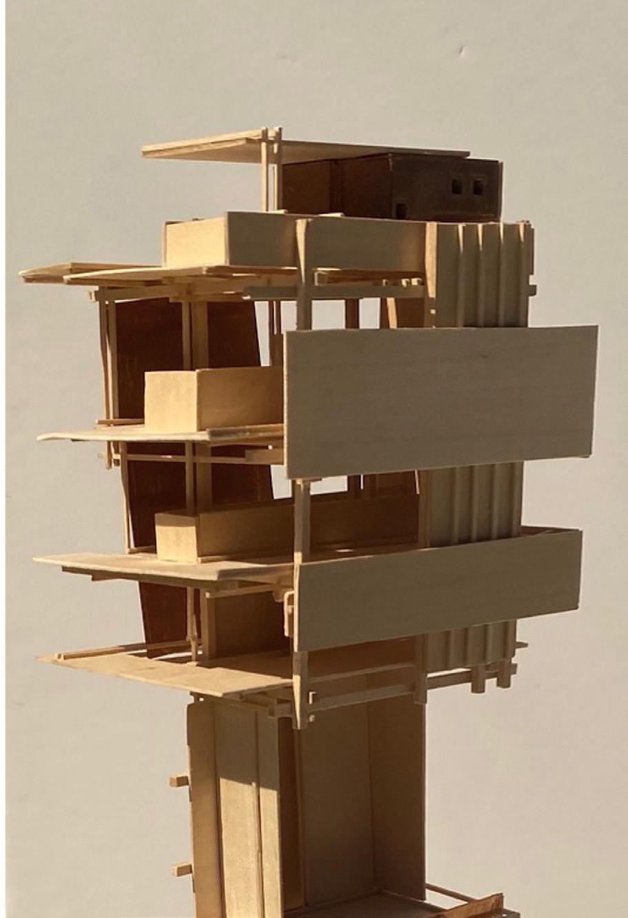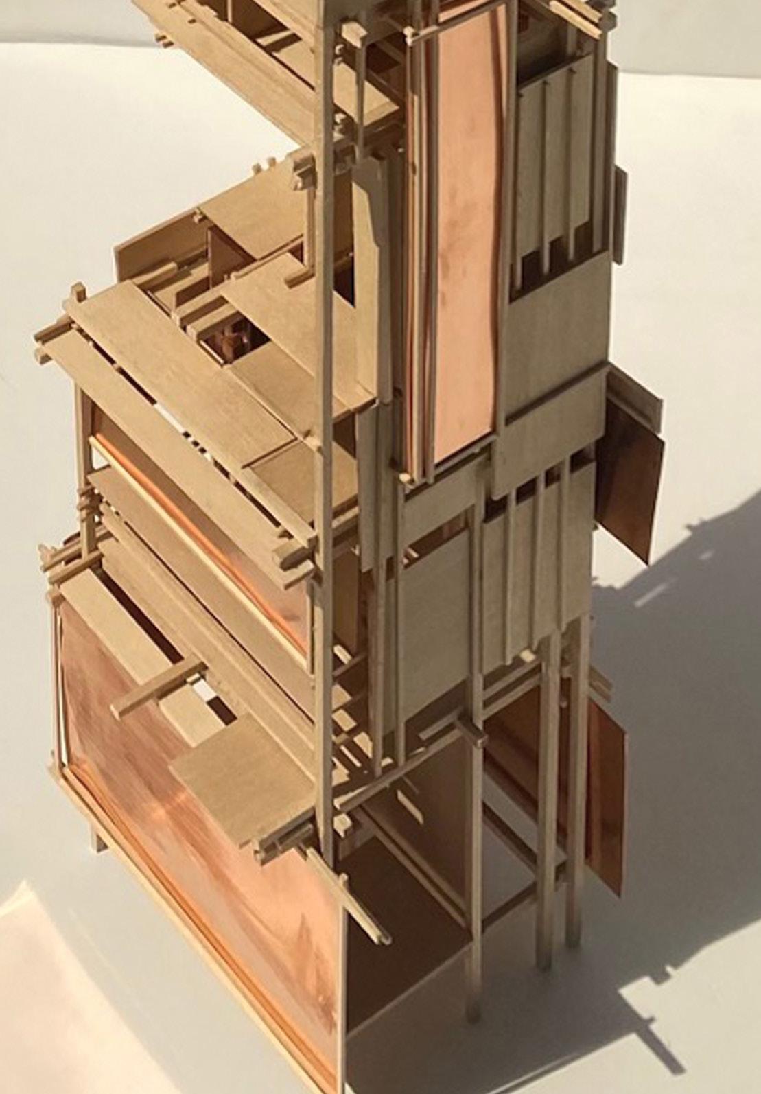 The Copper Tower is a medical facility that connects three stages of a medical prosthetics facility for athletes. These zones used the words palimpsest, balance, and calibration to guide their design. These words represented the spaces for manufacturing, medical evaluation, and testing. Through collage of various metropolises from around the world, a datum representing cultural fabric was crafted. As to influ ence a connection with the sky that humanity has with the earth.