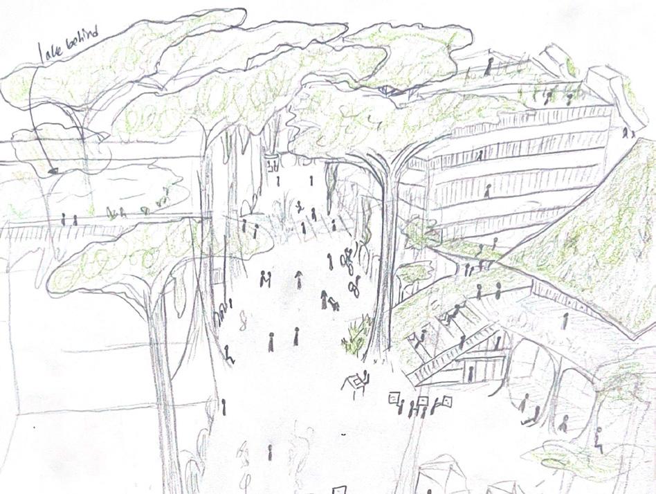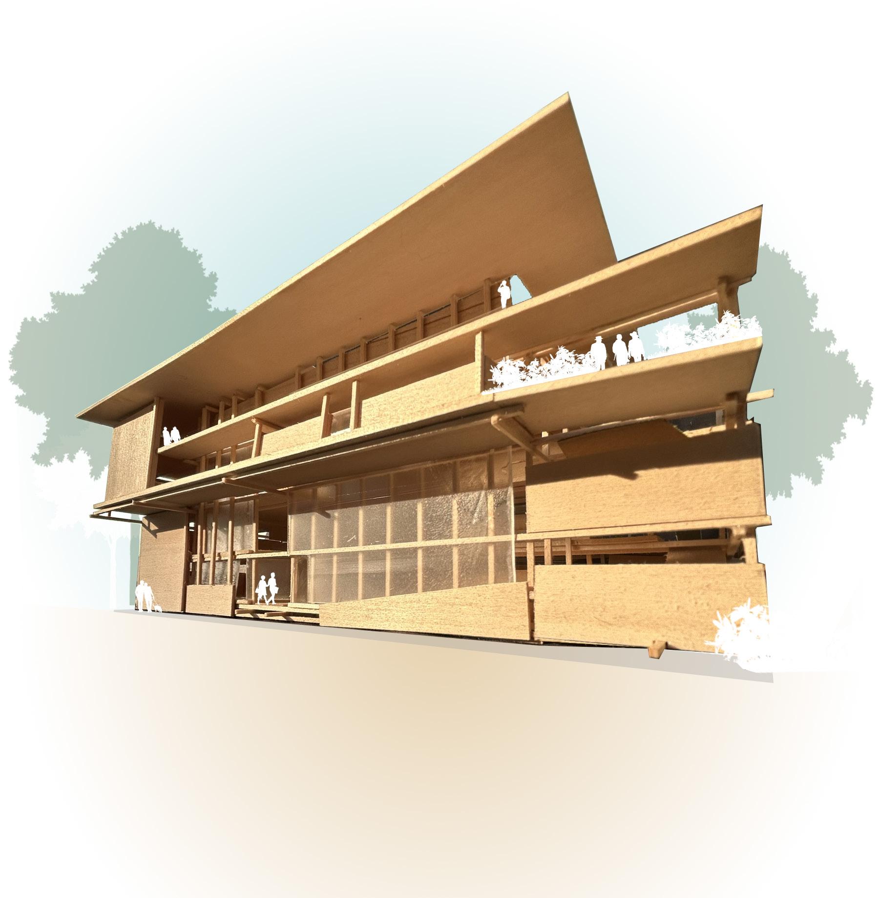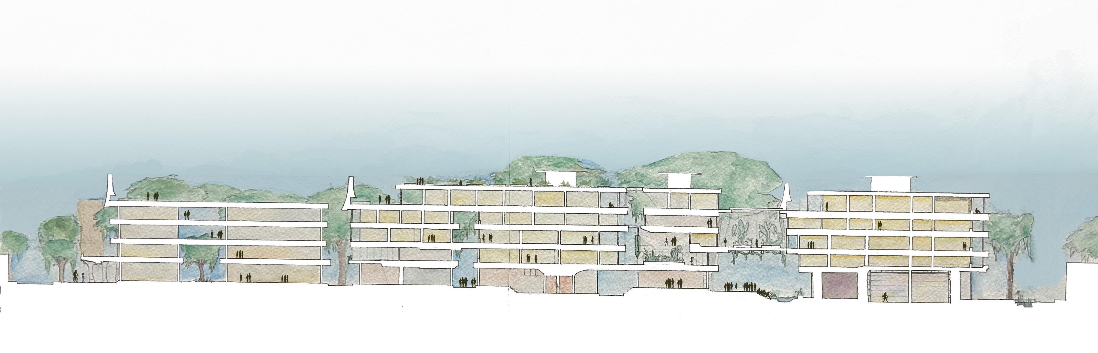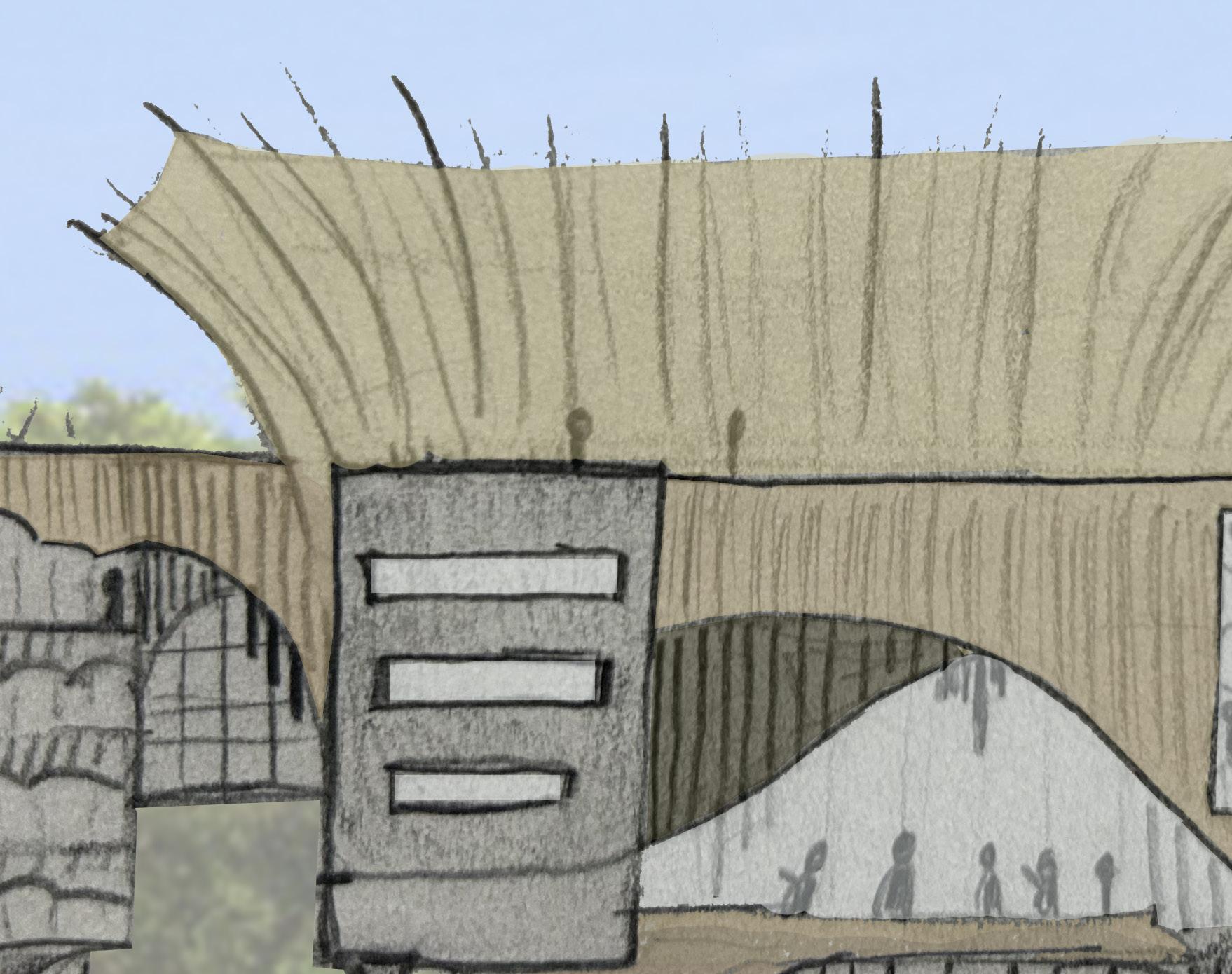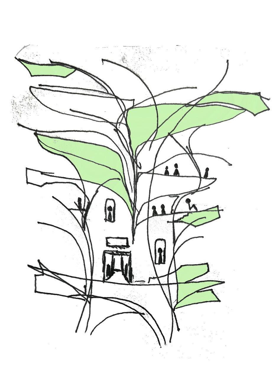 ABOVE: Edited watercolor section drawing showing overlap between plant life, human spaces and bat houses (thin tower structures).