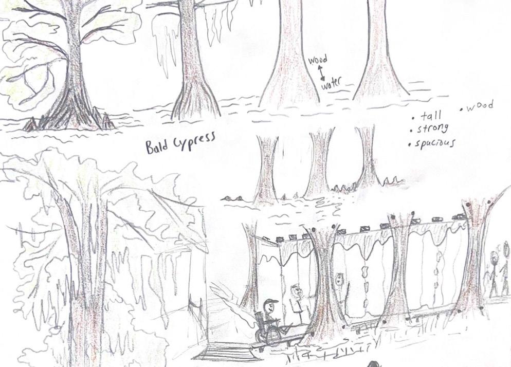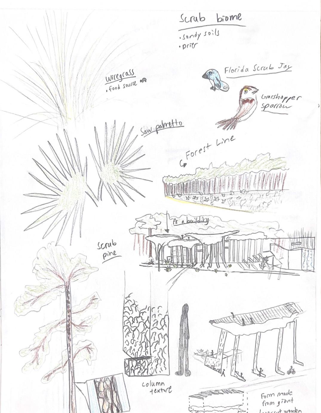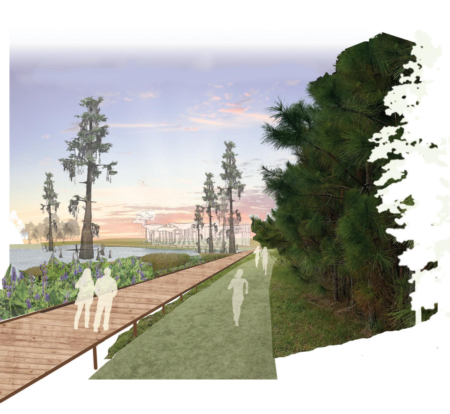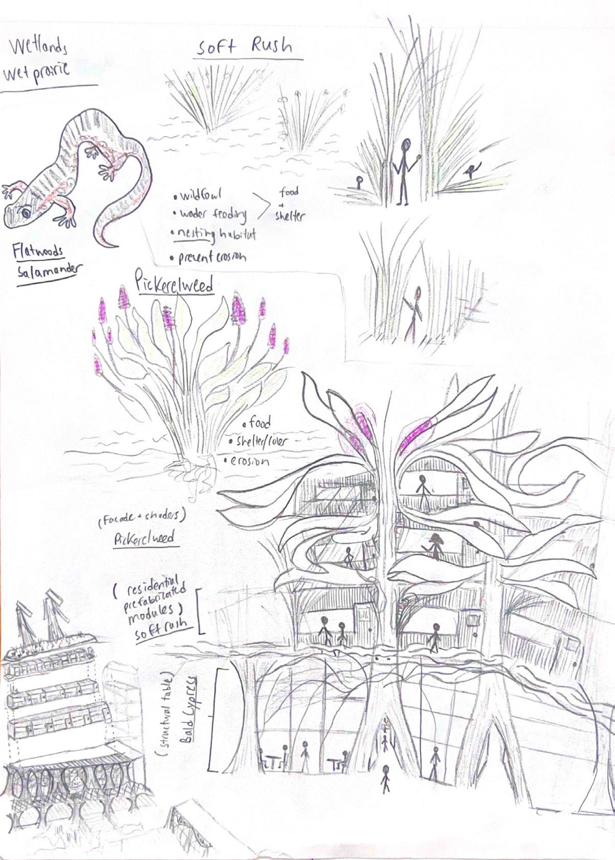 To repair the relationship between the city, and its natural systems, a 10 acre asphalt site and surrounding brownfields are fully rewilded. Man and nature overlap, connect and form a closer relationship. At the city level, the site reconnects the Sweetwater wetlands to the south and the northern scrub forests to Depot park. At the site level, flora and fauna structures are woven together with human spaces. Sustainable, natural materials are combined with recycled man made construction.