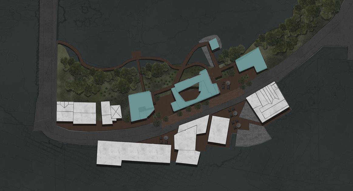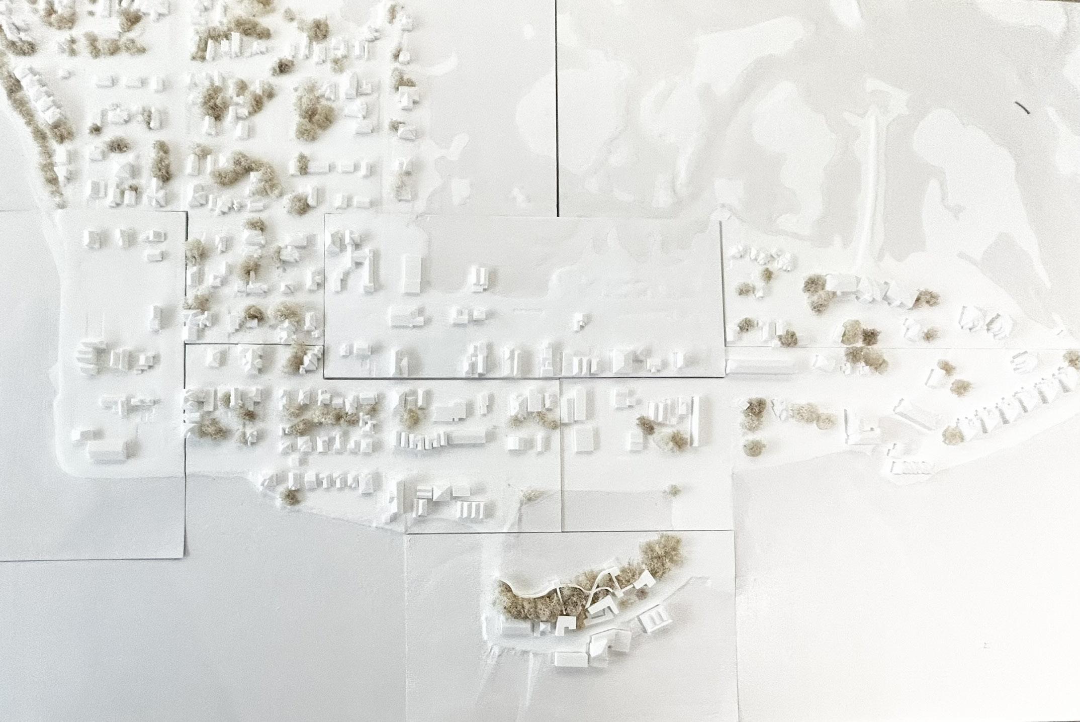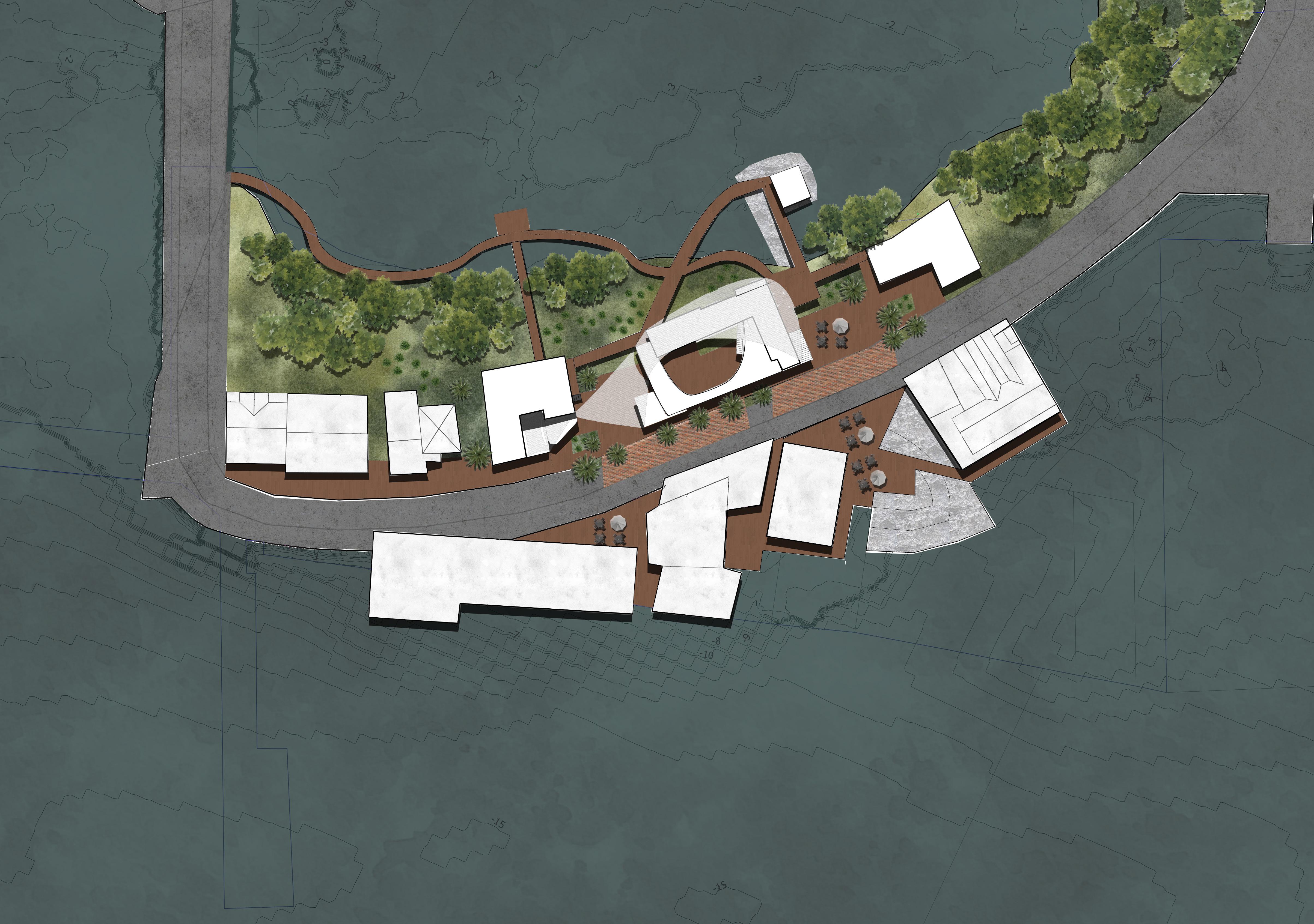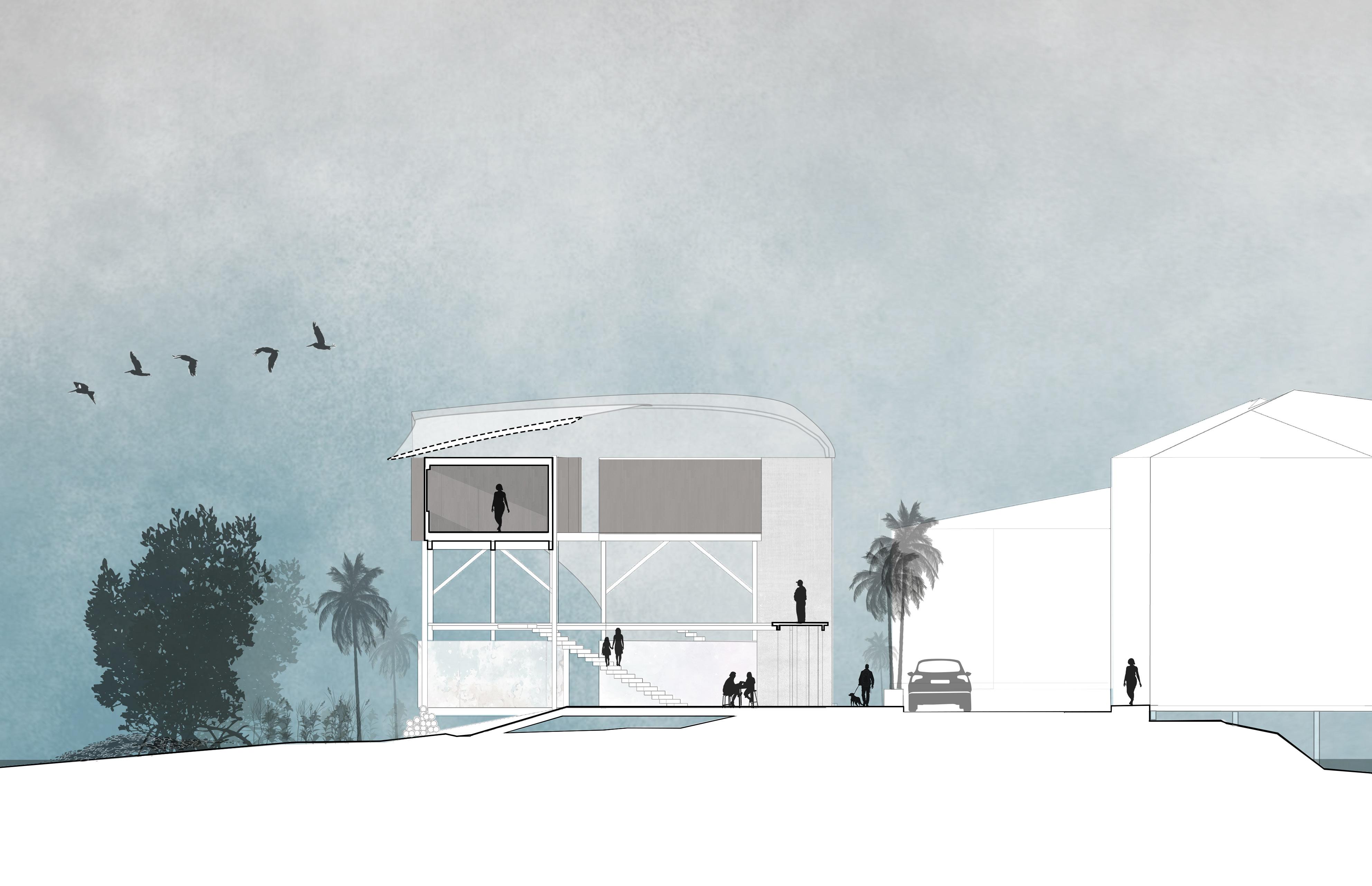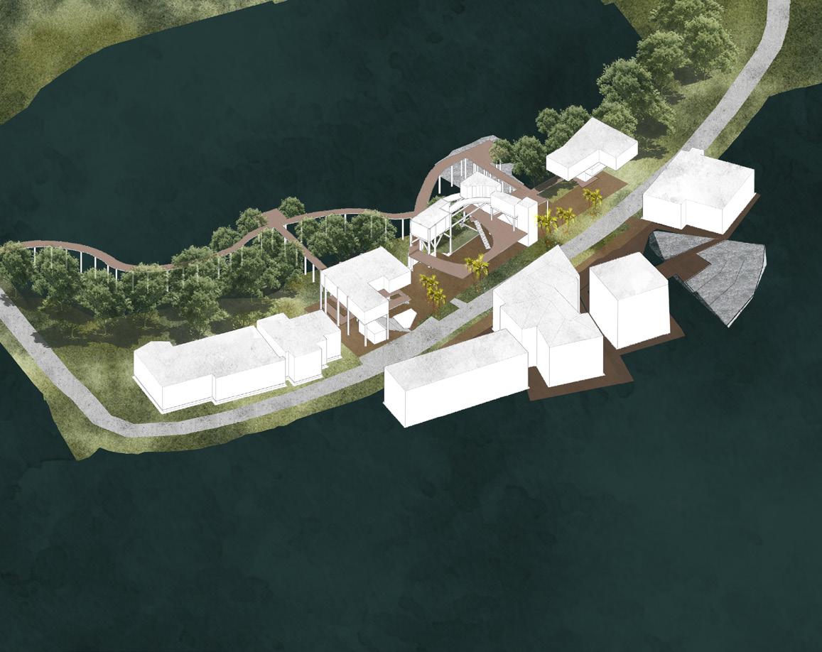 Each year, storm surge ravages the town of Cedar Key, destroying commercial and residential infrastructure. Mangrove Landing buildings establish a new connection with the ocean, allowing floodwater to pass through open public spaces. Through use of recycled material, small impermeable constructs maintain the street edge. Restoration of mangrove forest and oyster beds creates a natural wave buffer and creates a cultural space for recreation.