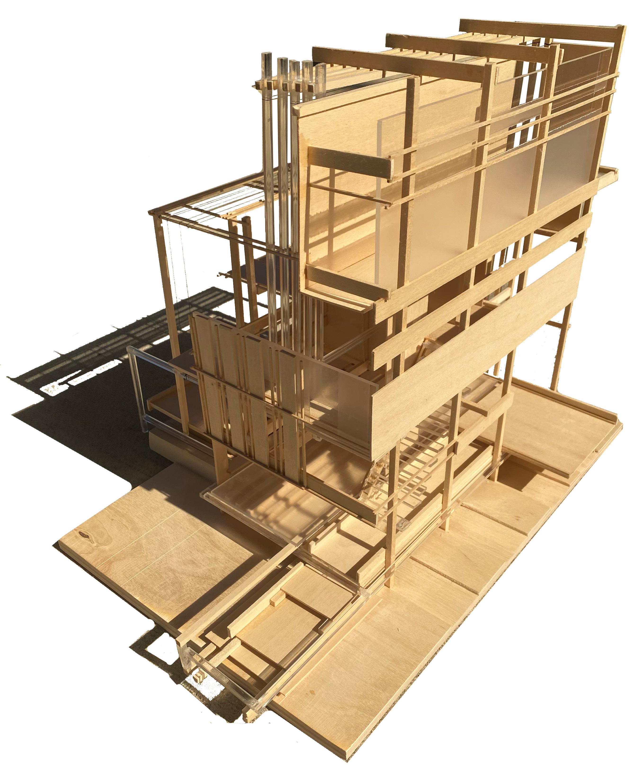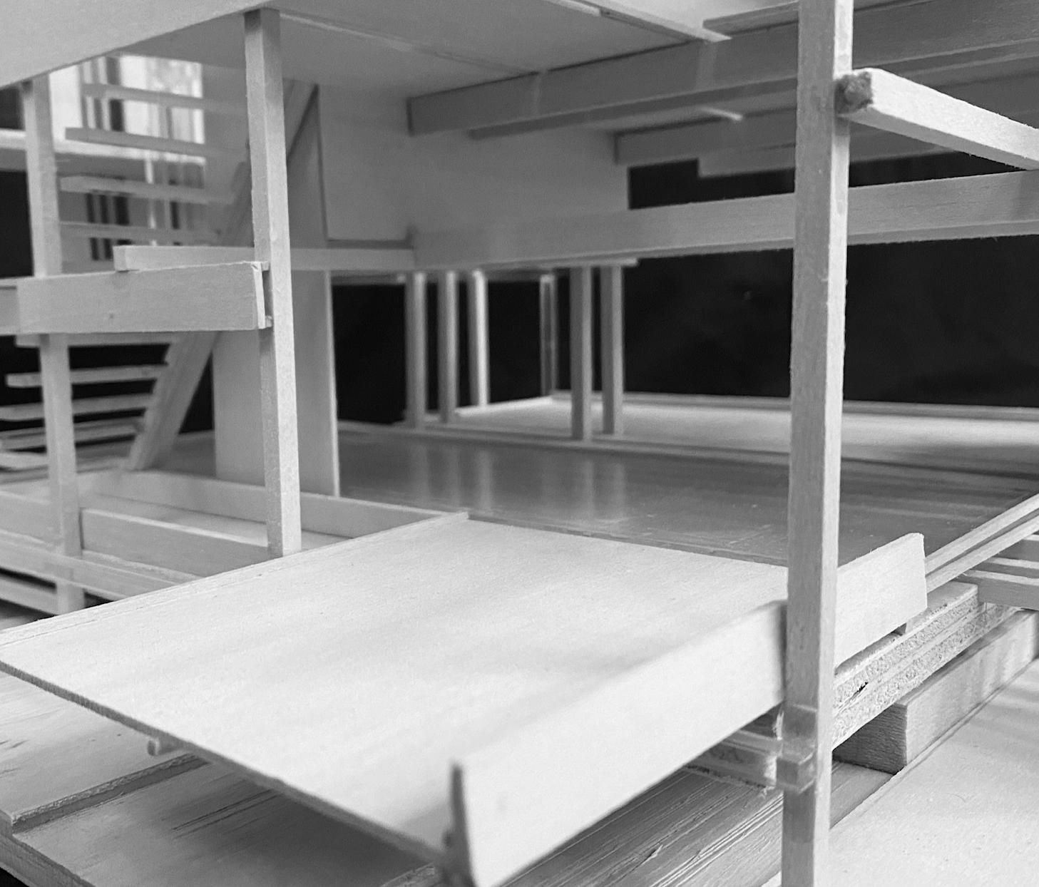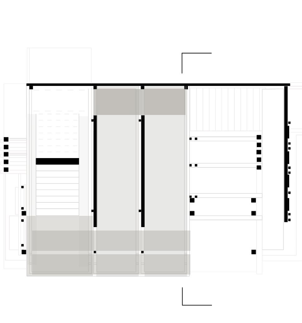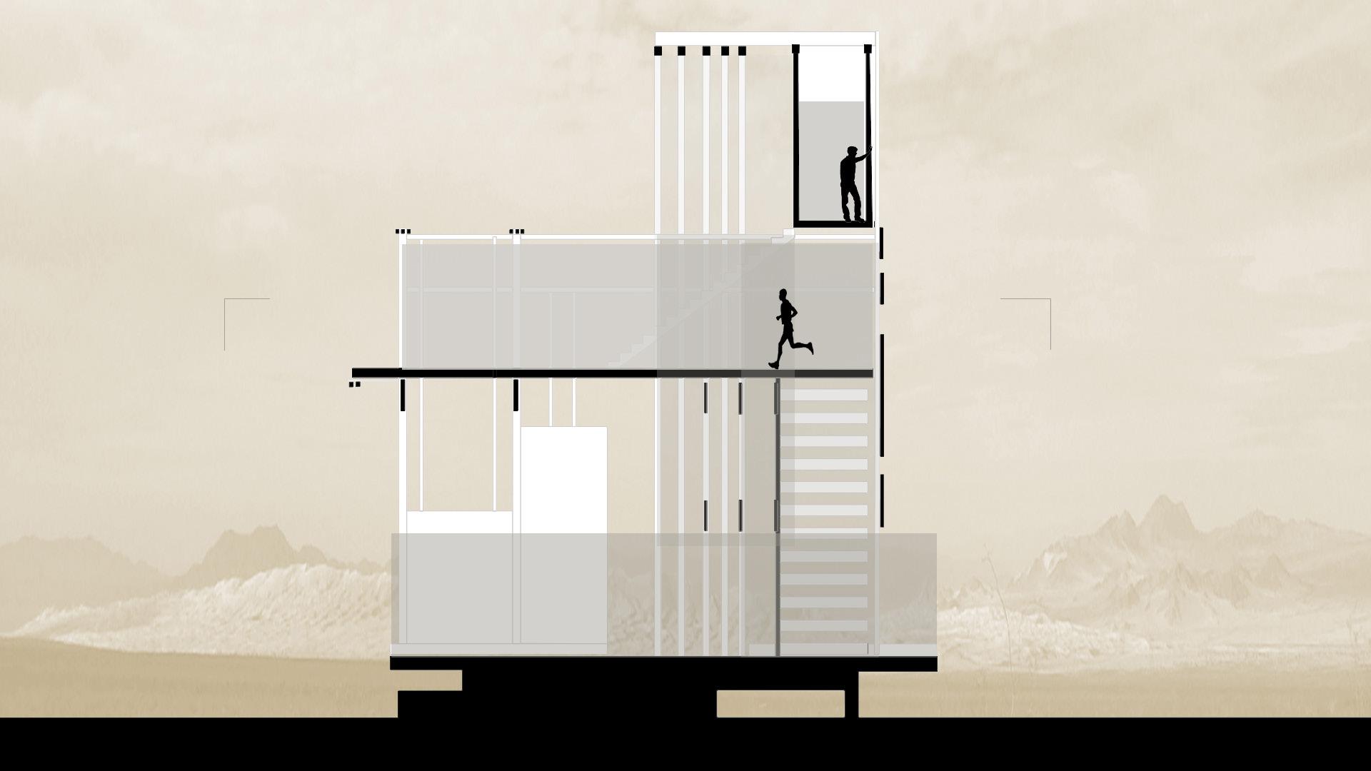 Plan drawing of second level ABOVE: Section drawing showing 3 main spaces