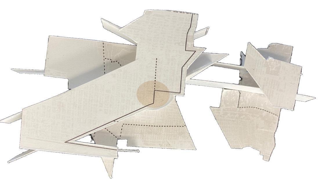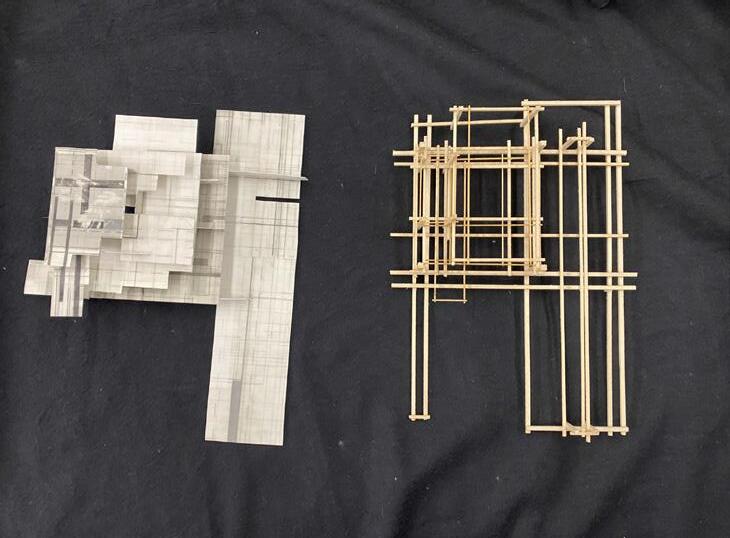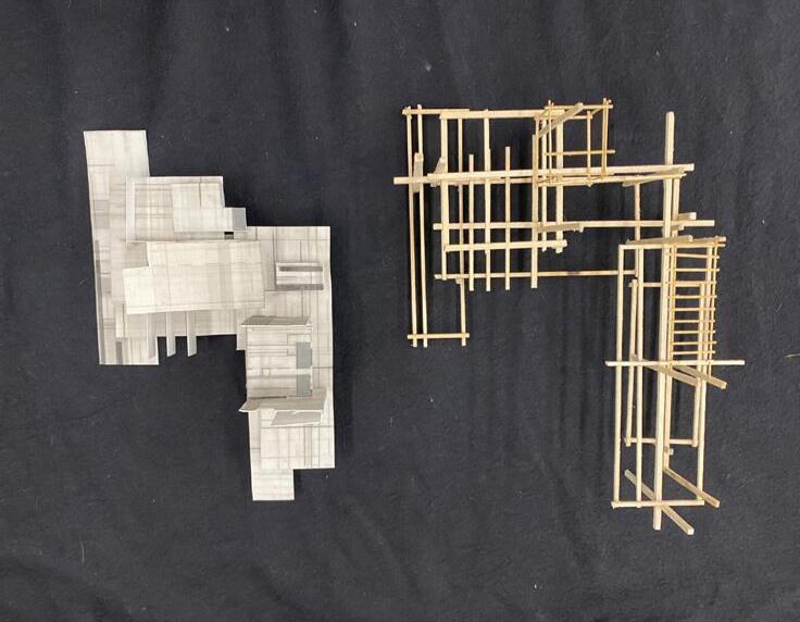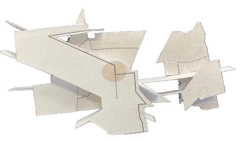 LEFT: A mapping of different events in the film. BELOW: The mapping was collaged 3-dimensionally to create a basic structure for the house.