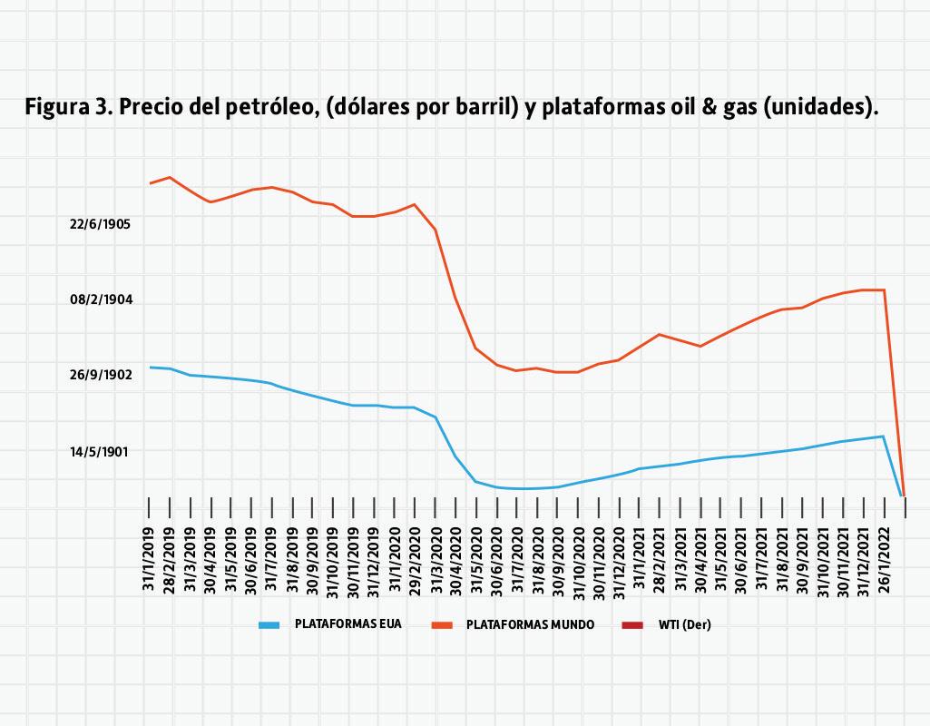 Las menores proyecciones de crecimiento de Estados Unidos y China reducirán la demanda de petróleo; que se conjugará con una mayor oferta de crudo, dada la recuperación de la producción en plataformas a nivel mundial. El alza significativa de los precios del petróleo registrados durante los últimos 12 meses ha impulsado el número de plataformas para la producción de petróleo y gas (actualmente el West Texas Intermediate o WTI se encuentra en máximos desde 2019), ya que el punto de equilibrio para la rentabilidad del crudo de esquisto es considerable y muy atractivo. A lo anterior, se deben sumar las acciones de la OPEC para recuperar la oferta de manera gradual (en la reunión de enero se acordó inyectar 400 mil barriles diarios cada mes, hasta restituir alrededor de 4 millones barriles al mercado).