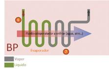 El fluido en un estado líquido y vapor se introduce en un intercambiador (evaporador) donde será cargado de energía calorífica del fluido (agua o aire) que se desea enfriar (fuente fría). Este calentamiento del refrigerante provoca su evaporación pasando del estado líquido con vapor a un estado gaseoso de baja presión.