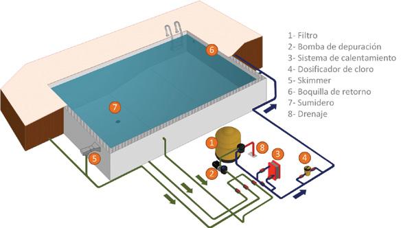En las albercas sin acondicionar, una gran parte de la energía eléctrica consumida corresponde al sistema de bombeo del sistema de filtración del agua (hasta 40%). Las bombas hacen circular el agua a través de los diferentes sistemas tales como filtración, calentamiento y tratamiento del agua para posteriormente reinyectar el agua a la alberca.