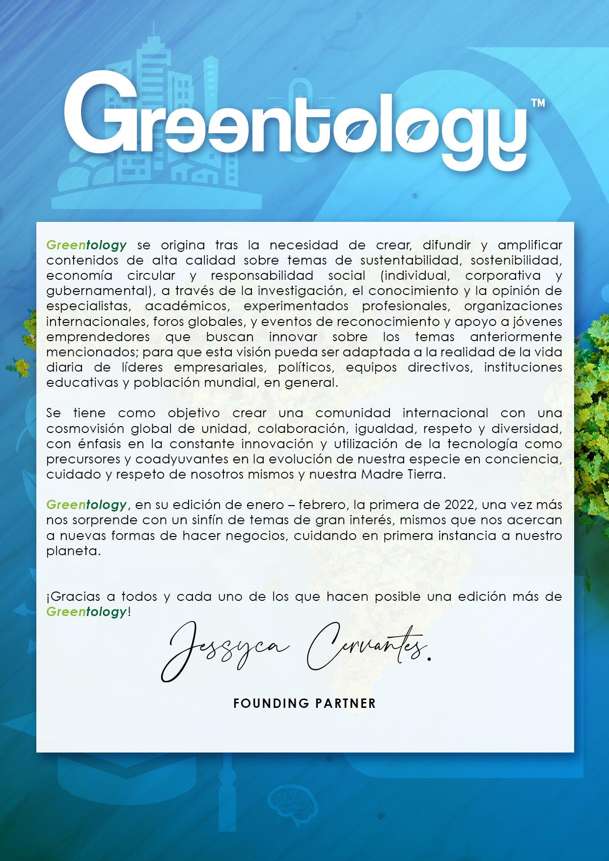 DIRECTOR DE ADMINISTRACIÓN Y FINANZAS Ernesto Sánchez Carrillo CONSEJO EDITORIAL Santiago Barcon Palomar Fabiola Díaz Rovelo Ángeles Díaz Vélez Antonio López Candiani Adriano Numa María José Treviño REDACCIÓN redaccion@smartmediagroup.lat PUBLICIDAD Y VENTAS ventas@smartmediagroup.lat SUSCRIPCIONES suscripciones@smartmediagroup.lat TELÉFONO (55) 6259 4607 (55) 6385 6607 Greentology Magazine es una publicación bimestral de Editorial Engrane, S.A. de C.V. Edición No. 03 Enero - Febrero 2022. Número del Certificado de Reserva otorgado por el Instituto Nacional de Derechos de Autor: 04-2018- 020612090100-102. Número de Certificado de Licitud de Titulo y Contenido No. 17171. Oficinas: Benjamín Franklin No. 166 -1A. Col. Escandón, CDMX, C.P. 11800, Teléfono (55) 6273 8853 SOMOS NOSOTROS SOMOS UN PLANETA Año 02 No. 03 ¡SeamoS circulareS! 5