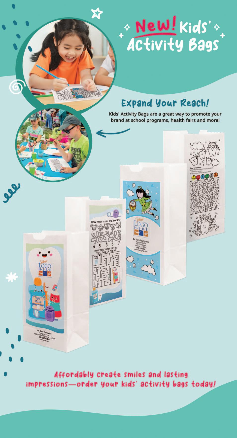 Grow your practice and strengthen community ties with Kids’ Activity Bags. Perfect for making a memorable impact in your office and at community events.