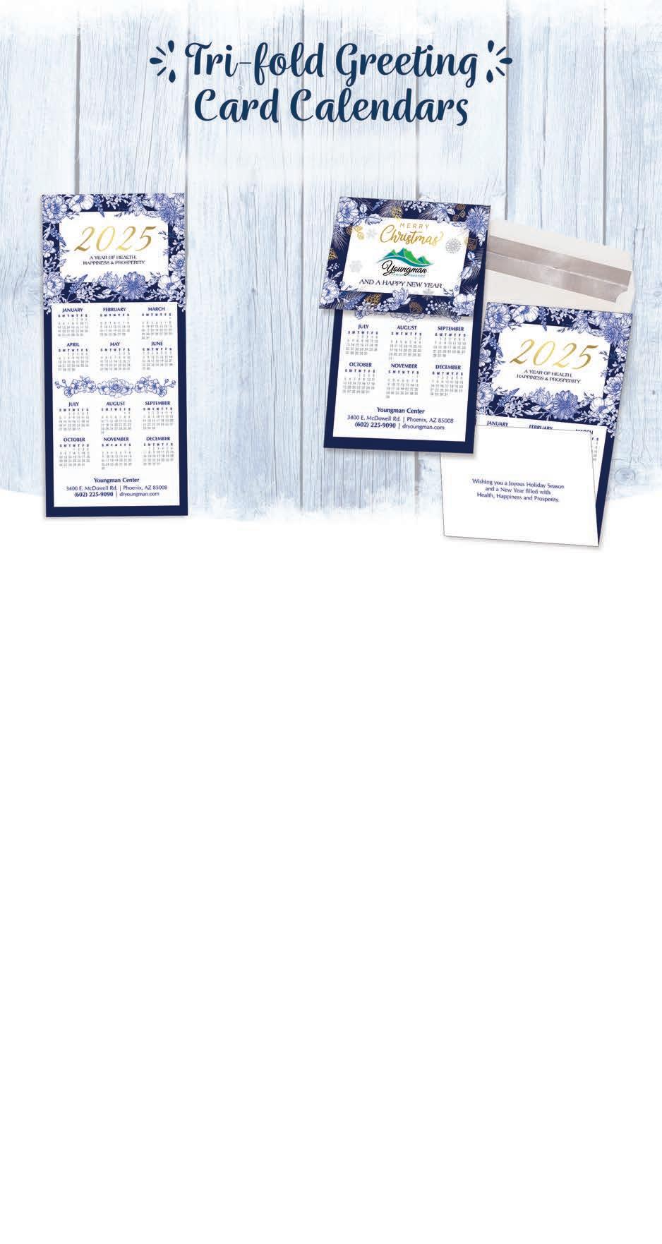 Tri-Fold Greeting Card Calendars are a calendar and greeting card in one! Send personalized holiday greetings to patients and colleagues with a full-color calendar they can display year round.