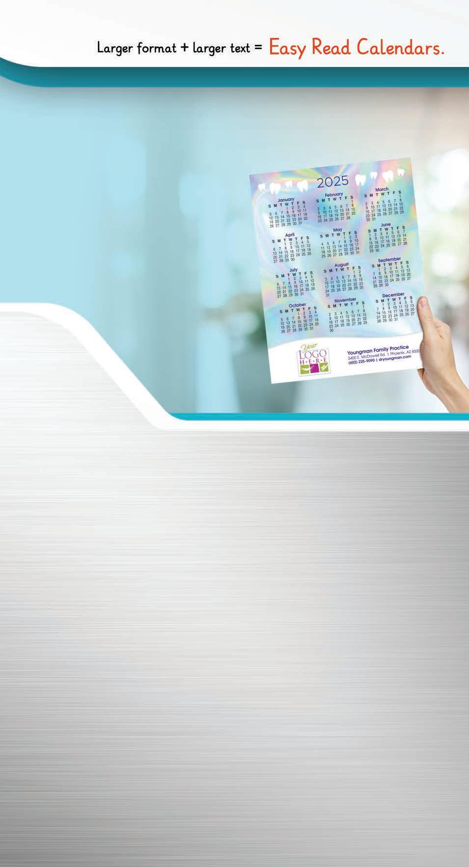 You asked for it, we delivered! All new Easy Read Magnet and ReStix™ Calendars are the perfect solution for patients with reduced vision. With sizes up to 4x bigger, your practice name and information can’t be missed.