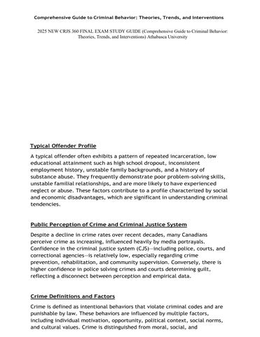 2025 NEW CRJS 360 FINAL EXAM STUDY GUIDE (Comprehensive Guide to Criminal Behavior: Theories, Trends, and Interventions) Athabasca University