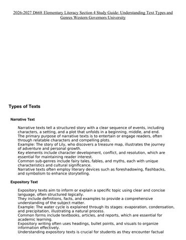 2026-2027 D668 Elementary Literacy Section 4 Study Guide: Understanding Text Types and Genres Western Governors University