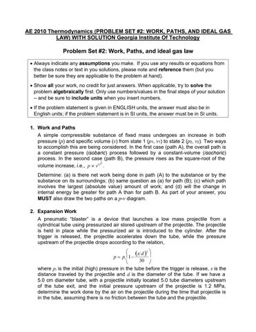 AE 2010 Thermodynamics (PROBLEM SET #2: WORK, PATHS, AND IDEAL GAS LAW) WITH SOLUTION Georgia Institute Of Technology