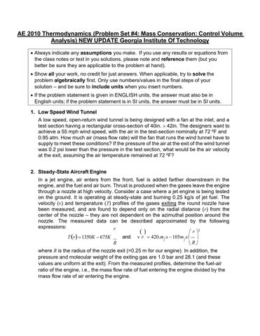 AE 2010 Thermodynamics (Problem Set #4: Mass Conservation: Control Volume Analysis) NEW UPDATE Georgia Institute Of Technology • Always indicate any assumptions you make. If you use any results or equations from the class notes or text in you solutions, please note and reference them (but you better be sure they are applicable to the problem at hand). • Show all your work, no credit for just answers. When applicable, try to solve the problem algebraically first. Only use numbers/values in the final steps of your solution – and be sure to include units when you insert numbers. • If the problem statement is given in ENGLISH units, the answer must also be in English units; if the problem statement is in SI units, the answer must be in SI units. 1. Low Speed Wind Tunnel A low speed, open-return wind tunnel is being designed with a fan at the inlet, and a test section having a rectangular cross-section of 40in. 42in. The designers want to achieve a 55 mph wind speed, with the air in the test-section nominally at 72 ºF and 0.95 atm. How much air (mass flow rate) will the fan that runs the wind tunnel have to supply to meet these conditions? If the pressure of the air at the exit of the wind tunnel was 0.2 psi lower than the pressure in the test section, what would be the air velocity at the exit, assuming the air temperature remained at 72 ºF? 2. Steady-State Aircraft Engine In a jet engine, air enters from the front, fuel is added farther downstream in the engine, and the fuel and air burn. Thrust is produced when the gases leave the engine through a nozzle at high velocity. Consider a case where a jet engine is being tested on the ground. It is operating at steady-state and burning 0.25 kg/s of jet fuel. The velocity (v) and temperature (T) profiles of the gases exiting the round nozzle have been measured, and are found to depend only on the radial distance (r) from the center of the nozzle – they are not dependent on the azimuthal position around the nozzle. The measured data can be described approximated by the following expressions: r () r 2 and v r = 420.m s − 105m s T (r) = 1350K − 675K R R where R is the radius of the nozzle exit (=0.25 m for our engine). In addition, the pressure and molecular weight of the exiting gas are 1.0 bar and 28.1 (and these values are uniform at the exit). From the measured profiles, determine the fuel-air ratio of the engine, i.e., the mass flow rate of fuel entering the engine divided by the mass flow rate of air entering the engine.
