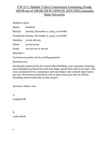 CM 3111 Module 2 Quiz Construction Estimating (Grade 100.00 out of 100.00) NEW UPDATE 2025-2026 Louisiana State University Module 2 Quiz Status