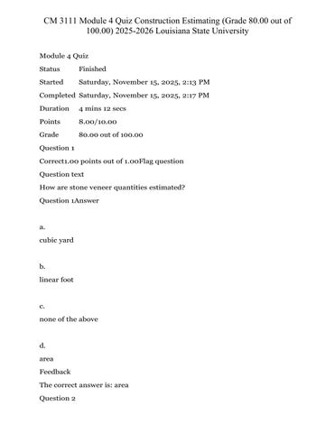 CM 3111 Module 4 Quiz Construction Estimating (Grade 80.00 out of 100.00) 2025-2026 Louisiana State University Module 4 Quiz Status