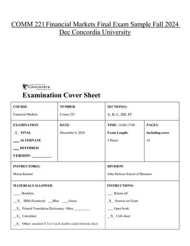 COMM 221 Financial Markets Final Exam Sample Fall 2024 Dec Concordia University