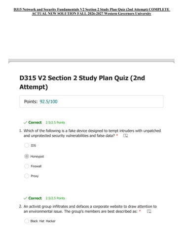 D315 Network and Security Fundamentals V2 Section 2 Study Plan Quiz (2nd Attempt) COMPLETE ACTUAL NEW SOLUTION FALL 2026-2027 Western Governors University