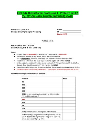 Problem Set #2 Posted: Friday, Sept. 20, 2024 Due: Thursday, Oct. 3, 2024 (4h00 pm) Notes: • Indicate the course number for which you are registered (i.e. 412 or 512) • Upload your solution on myCourses before the above deadline. Use a single pdf file, including cover page and problem solutions in correct order. • Files that do not include this cover page or are not legible will not be marked. • All the problems are taken from the course textbook: A. V. Oppenheim and R. W. Schafer, Discrete-Time Signal Processing, 3rd Ed., Prentice Hall, 2010. • For problems that require use of MATLAB, include your program code as well as the figures. • Problem numbers in red font (marked with *) are only for students registered in ECSE-512. Solve the following problems from the textbook: Problem 3.3 3.16 3.29 3.30 3.32 (you can use computer program to determine the PFE coefficients in par a) 3.49 3.54 5.8 5.18 5.24 (comment on the missing zero in the PZ plot) 5.28 For part (c) use geometrical interpretation; add (e) Use Matlab to obtain plots of the magnitude response, phase response and group delay
