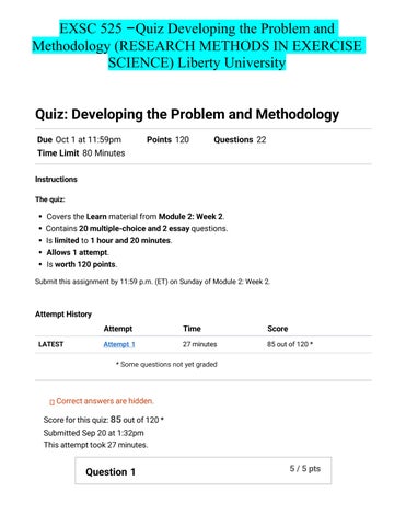 EXSC 525 –Quiz Developing the Problem and Methodology (RESEARCH METHODS IN EXERCISE SCIENCE) Liberty University Quiz: Developing the Problem and Methodology Due Oct 1 at 11:59pm