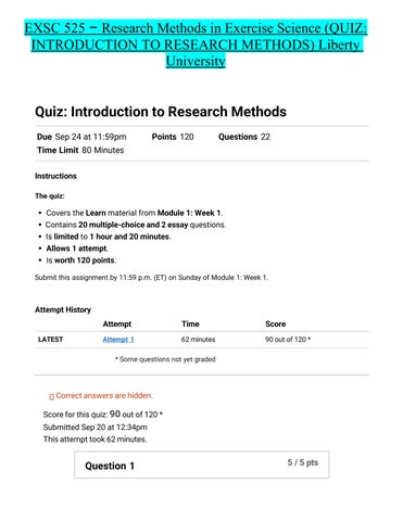 EXSC 525 – Research Methods in Exercise Science (QUIZ: INTRODUCTION TO RESEARCH METHODS) Liberty University Quiz: Introduction to Research Methods Due Sep 24 at 11:59pm
